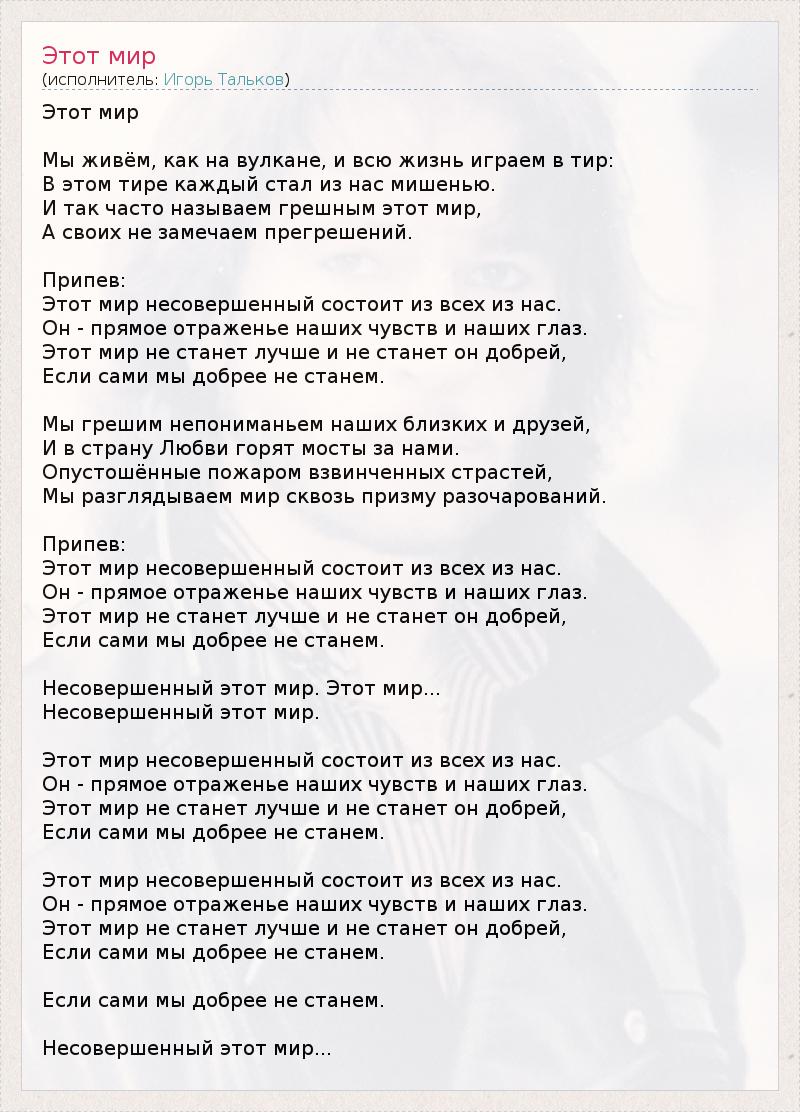 Это интересно:И́горь Влади́мирович Талько́в (4 ноября 1956, Грецовка, Щёкинский район, Тульская область — 6 октября 1991, Ленинград) — певец, автор песен, поэт, киноактёр.В начале творческого пути сотрудничал с группами «Апрель», «Калейдоскоп» и «Электроклуб». В это время Игорем было написано много песен, но он не имел возможности исполнять их.Впервые стал известен широкой публике после выступления... продолжение