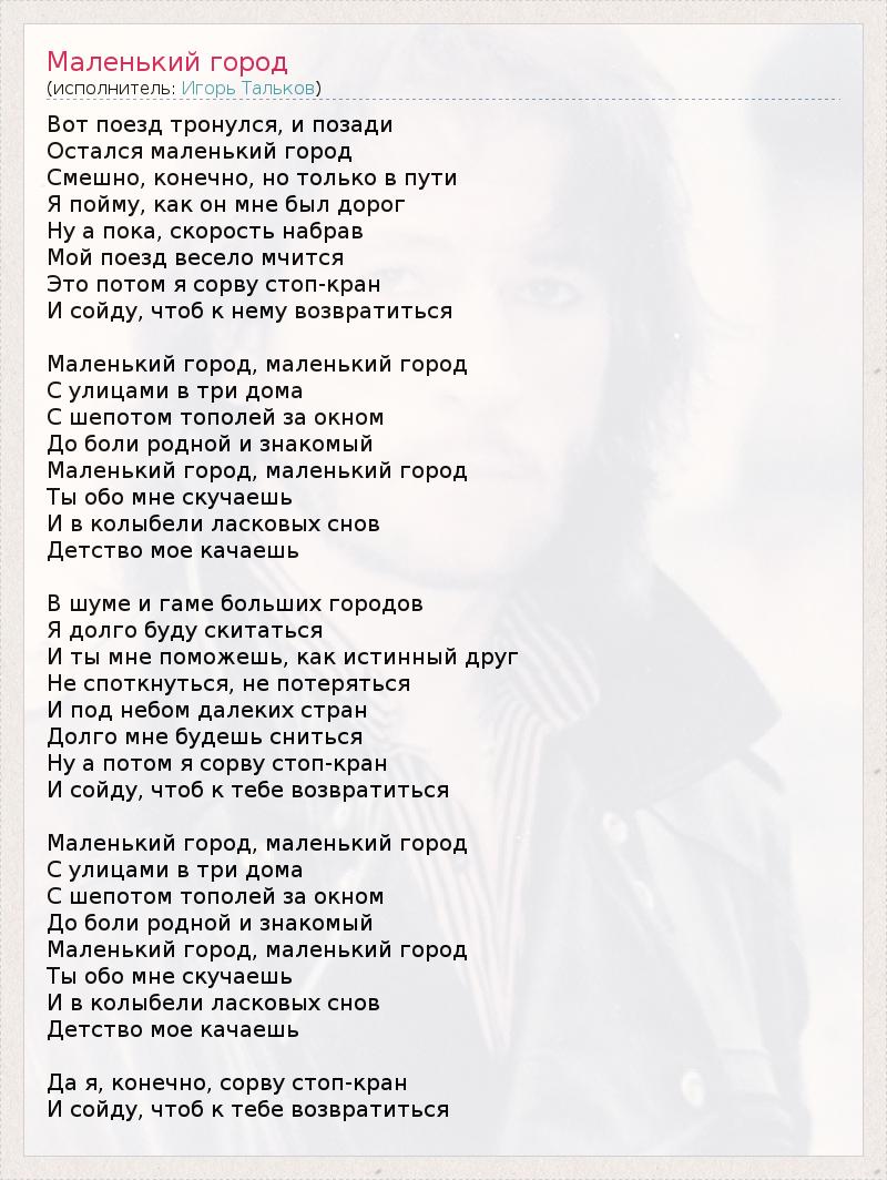 Это интересно:И́горь Влади́мирович Талько́в (4 ноября 1956, Грецовка, Щёкинский район, Тульская область — 6 октября 1991, Ленинград) — певец, автор песен, поэт, киноактёр.В начале творческого пути сотрудничал с группами «Апрель», «Калейдоскоп» и «Электроклуб». В это время Игорем было написано много песен, но он не имел возможности исполнять их.Впервые стал известен широкой публике после выступления... продолжение