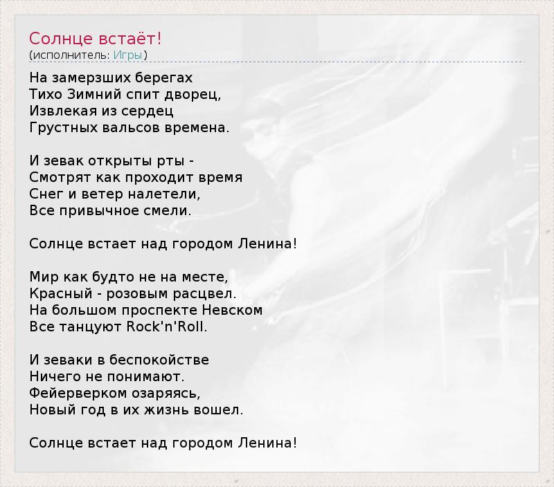 Это интересно:ИГРЫ — советская и российская рок-группа второй половины 80-х годов (Ленинград, Санкт-Петербург). Группа возникла из пепла группы Странные Игры, культовых героев Ленинградского рок-клуба и пионеров "новой волны" на отечественной рок-сцене, после их раскола в самом зените славы летом 1985.www.gruppaigry.su... продолжение