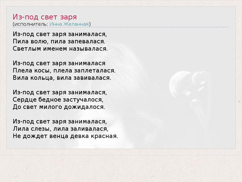 Из-под свет заря занималася, Пила волю, пила запевалася. Светлым именем называлася. Из-под свет заря занималася Плела косы, плела заплеталася. Вила кольца, вила завивалася. Из-под свет заря занималася, Сердце бедное застучалося, До свет милого дожидалося. Из-под свет заря занималася, Лила слезы, лила заливалася, Не дождет венца девка красная.