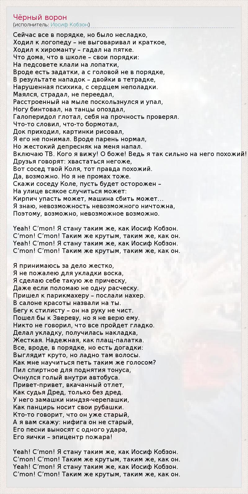 Сейчас все в порядке, но было несладко, Ходил к логопеду – не выговаривал и краткое, Ходил к хироманту – гадал на пятке. Что дома, что в школе – свои порядки: На педсовете клали на лопатки, Вроде есть задатки, а с головой не в порядке, В результате нападок – двойки в тетрадке, Нарушенная психика, с сердцем неполадки. Маялся, страдал, не переедал, Расстроенный на мыле поскользнулся и упал, Ногу бинтовал, на танцы опоздал, Галоперидол глотал, себя на прочность проверял. Что-то словил, что-то бормотал, Док приходил, картинки рисовал, Я его не понимал. Вроде парень нормал, Но жестокий депресняк на меня напал. Включаю ТВ. Кого я вижу! О боже! Ведь я так сильно на него похожий! Друзья говорят: хвастаться негоже, Вот сосед твой Коля, тот правда похожий. Да, возможно. Но я не промах тоже. Скажи соседу Коле, пусть будет осторожен – На улице всякое случиться может: Кирпич упасть может, машина сбить может… Я знаю, невозможность невозможного ничтожна, Поэтому, возможно, невозможное возможно. Yeah! C’mon! Я стану таким же, как Иосиф Кобзон. C’mon! C’mon! Таким же крутым, таким же, как он. Yeah! C’mon! Я стану таким же, как Иосиф Кобзон. C’mon! C’mon! Таким же крутым, таким же, как он. Я принимаюсь за дело жестко, Я не пожалею для укладки воска, Я сделаю себе такую же прическу, Даже если поломаю не одну расческу. Пришел к парикмахеру – послали нахер. В салоне красоты назвали на ты. Бегу к стилисту – он на руку не чист. Пошел бы к Звереву, но я не верю ему. Никто не говорил, что все пройдет гладко. Делал укладку, получилась накладка, Жесткая. Надежная, как плащ-палатка. Все, вроде, в порядке, но есть догадки: Выглядит круто, но ладно там волосы. Как мне научиться петь таким же голосом? Пил спиртное для поднятия тонуса, Очнулся голый внутри автобуса. Привет-привет, вкачанный отлет, Как судья Дред, только без дред. У него замашки ниндзя-черепашки, Как панцирь носит свои рубашки. Кто-то говорит, что он уже старый, А я вам скажу: нифига он не старый, Его песни выносят с одного удара, Его яички – эпицентр пожара! Yeah! C’mon! Я стану таким же, как Иосиф Кобзон. C’mon! C’mon! Таким же крутым, таким же, как он. Yeah! C’mon! Я стану таким же, как Иосиф Кобзон. C’mon! C’mon! Таким же крутым, таким же, как он.