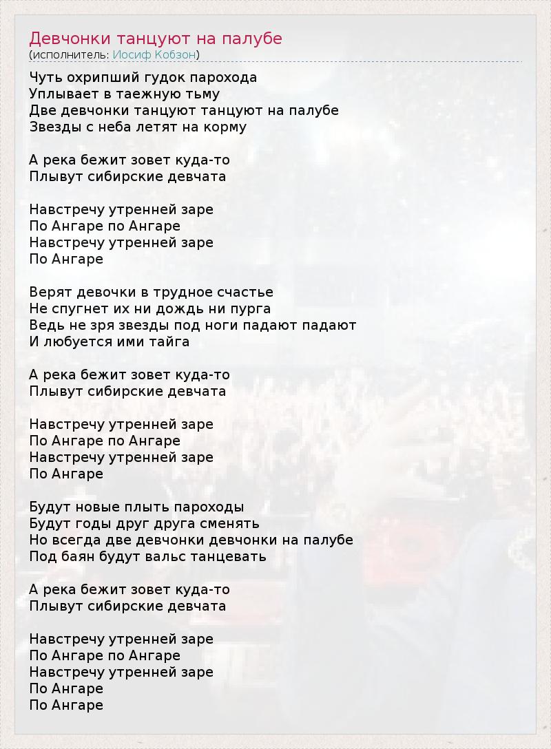 Чуть охрипший гудок парохода Уплывает в таежную тьму Две девчонки танцуют танцуют на палубе Звезды с неба летят на корму А река бежит зовет куда-то Плывут сибирские девчата Навстречу утренней заре По Ангаре по Ангаре Навстречу утренней заре По Ангаре Верят девочки в трудное счастье Не спугнет их ни дождь ни пурга Ведь не зря звезды под ноги падают падают И любуется ими тайга А река бежит зовет куда-то Плывут сибирские девчата Навстречу утренней заре По Ангаре по Ангаре Навстречу утренней заре По Ангаре Будут новые плыть пароходы Будут годы друг друга сменять Но всегда две девчонки девчонки на палубе Под баян будут вальс танцевать А река бежит зовет куда-то Плывут сибирские девчата Навстречу утренней заре По Ангаре по Ангаре Навстречу утренней заре По Ангаре По Ангаре