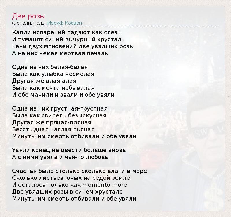 Капли испарений падают как слезы И туманят синий вычурный хрусталь Тени двух мгновений две увядших розы А на них немая мертвая печаль Одна из них белая-белая Была как улыбка несмелая Другая же алая-алая Была как мечта небывалая И обе манили и звали и обе увяли Одна из них грустная-грустная Была как свирель безыскусная Другая же пряная-пряная Бесстыдная наглая пьяная Минуты им смерть отбивали и обе увяли Увяли конец не цвести больше вновь А с ними увяла и чья-то любовь Счастья было столько сколько влаги в море Сколько листьев юных на седой земле И осталось только как momento more Две увядших розы в синем хрустале Минуты им смерть отбивали и обе увяли