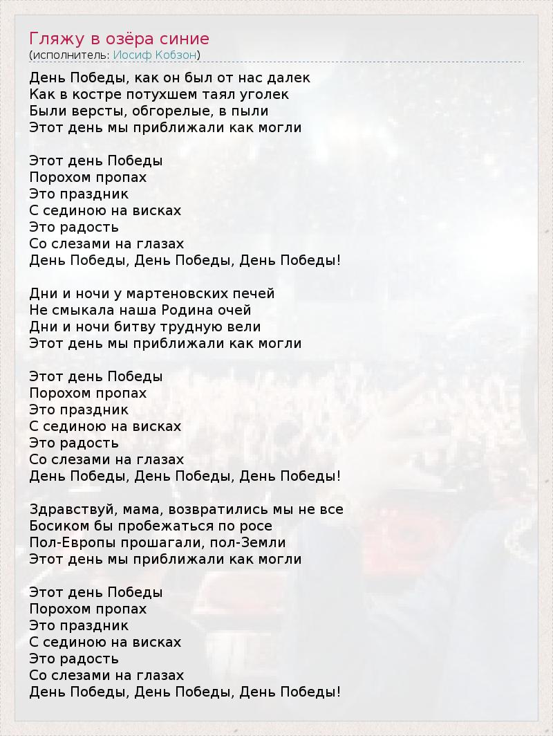 День Победы, как он был от нас далек Как в костре потухшем таял уголек Были версты, обгорелые, в пыли Этот день мы приближали как могли Этот день Победы Порохом пропах Это праздник С сединою на висках Это радость Со слезами на глазах День Победы, День Победы, День Победы! Дни и ночи у мартеновских печей Не смыкала наша Родина очей Дни и ночи битву трудную вели Этот день мы приближали как могли Этот день Победы Порохом пропах Это праздник С сединою на висках Это радость Со слезами на глазах День Победы, День Победы, День Победы! Здравствуй, мама, возвратились мы не все Босиком бы пробежаться по росе Пол-Европы прошагали, пол-Земли Этот день мы приближали как могли Этот день Победы Порохом пропах Это праздник С сединою на висках Это радость Со слезами на глазах День Победы, День Победы, День Победы!