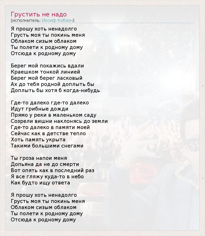Я прошу хоть ненадолго Грусть моя ты покинь меня Облаком сизым облаком Ты полети к родному дому Отсюда к родному дому Берег мой покажись вдали Краешком тонкой линией Берег мой берег ласковый Ах до тебя родной доплыть бы Доплыть бы хотя б когда-нибудь Где-то далеко где-то далеко Идут грибные дожди Прямо у реки в маленьком саду Созрели вишни наклонясь до земли Где-то далеко в памяти моей Сейчас как в детстве тепло Хоть память укрыта Такими большими снегами Ты гроза напои меня Допьяна да не до смерти Вот опять как в последний раз Я все гляжу куда-то в небо Как будто ищу ответа Я прошу хоть ненадолго Грусть моя ты покинь меня Облаком сизым облаком Ты полети к родному дому Отсюда к родному дому