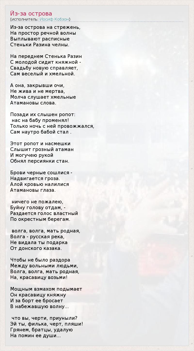 Из-за острова на стрежень, На простор речной волны Выплывают расписные Стеньки Разина челны. На переднем Стенька Разин С молодой сидит княжной - Свадьбу новую справляет, Сам веселый и хмельной. А она, закрывши очи, Не жива и не мертва, Молча слушает хмельные Атамановы слова. Позади их слышен ропот: нас на бабу променял! Только ночь с ней провожжался, Сам наутро бабой стал . Этот ропот и насмешки Слышит грозный атаман И могучею рукой Обнял персиянки стан. Брови черные сошлися - Надвигается гроза. Алой кровью налилися Атамановы глаза. ничего не пожалею, Буйну голову отдам, - Раздается голос властный По окрестным берегам. волга, волга, мать родная, Волга - русская река, Не видала ты подарка От донского казака. Чтобы не было раздора Между вольными людьми, Волга, волга, мать родная, На, красавицу возьми! Мощным взмахом подымает Он красавицу княжну И за борт ее бросает В набежавшую волну... что вы, черти, приуныли? Эй ты, филька, черт, пляши! Грянем, братцы, удалую На помин ее души...