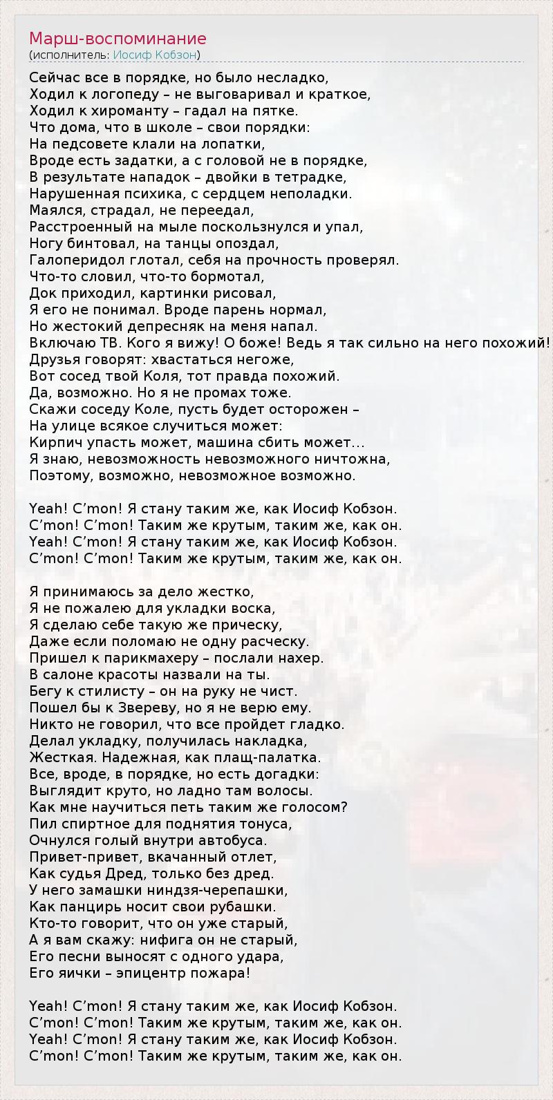 Сейчас все в порядке, но было несладко, Ходил к логопеду – не выговаривал и краткое, Ходил к хироманту – гадал на пятке. Что дома, что в школе – свои порядки: На педсовете клали на лопатки, Вроде есть задатки, а с головой не в порядке, В результате нападок – двойки в тетрадке, Нарушенная психика, с сердцем неполадки. Маялся, страдал, не переедал, Расстроенный на мыле поскользнулся и упал, Ногу бинтовал, на танцы опоздал, Галоперидол глотал, себя на прочность проверял. Что-то словил, что-то бормотал, Док приходил, картинки рисовал, Я его не понимал. Вроде парень нормал, Но жестокий депресняк на меня напал. Включаю ТВ. Кого я вижу! О боже! Ведь я так сильно на него похожий! Друзья говорят: хвастаться негоже, Вот сосед твой Коля, тот правда похожий. Да, возможно. Но я не промах тоже. Скажи соседу Коле, пусть будет осторожен – На улице всякое случиться может: Кирпич упасть может, машина сбить может… Я знаю, невозможность невозможного ничтожна, Поэтому, возможно, невозможное возможно. Yeah! C’mon! Я стану таким же, как Иосиф Кобзон. C’mon! C’mon! Таким же крутым, таким же, как он. Yeah! C’mon! Я стану таким же, как Иосиф Кобзон. C’mon! C’mon! Таким же крутым, таким же, как он. Я принимаюсь за дело жестко, Я не пожалею для укладки воска, Я сделаю себе такую же прическу, Даже если поломаю не одну расческу. Пришел к парикмахеру – послали нахер. В салоне красоты назвали на ты. Бегу к стилисту – он на руку не чист. Пошел бы к Звереву, но я не верю ему. Никто не говорил, что все пройдет гладко. Делал укладку, получилась накладка, Жесткая. Надежная, как плащ-палатка. Все, вроде, в порядке, но есть догадки: Выглядит круто, но ладно там волосы. Как мне научиться петь таким же голосом? Пил спиртное для поднятия тонуса, Очнулся голый внутри автобуса. Привет-привет, вкачанный отлет, Как судья Дред, только без дред. У него замашки ниндзя-черепашки, Как панцирь носит свои рубашки. Кто-то говорит, что он уже старый, А я вам скажу: нифига он не старый, Его песни выносят с одного удара, Его яички – эпицентр пожара! Yeah! C’mon! Я стану таким же, как Иосиф Кобзон. C’mon! C’mon! Таким же крутым, таким же, как он. Yeah! C’mon! Я стану таким же, как Иосиф Кобзон. C’mon! C’mon! Таким же крутым, таким же, как он.