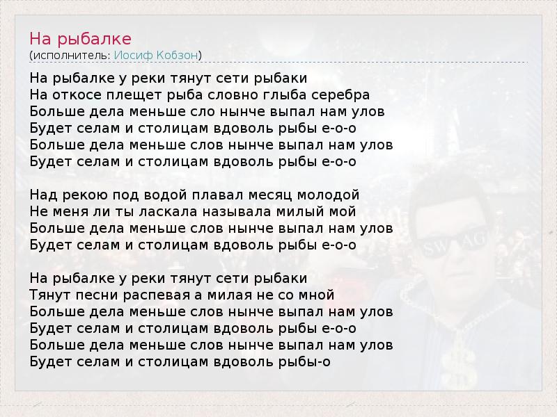 На рыбалке у реки тянут сети рыбаки На откосе плещет рыба словно глыба серебра Больше дела меньше сло нынче выпал нам улов Будет селам и столицам вдоволь рыбы е-о-о Больше дела меньше слов нынче выпал нам улов Будет селам и столицам вдоволь рыбы е-о-о Над рекою под водой плавал месяц молодой Не меня ли ты ласкала называла милый мой Больше дела меньше слов нынче выпал нам улов Будет селам и столицам вдоволь рыбы е-о-о На рыбалке у реки тянут сети рыбаки Тянут песни распевая а милая не со мной Больше дела меньше слов нынче выпал нам улов Будет селам и столицам вдоволь рыбы е-о-о Больше дела меньше слов нынче выпал нам улов Будет селам и столицам вдоволь рыбы-о