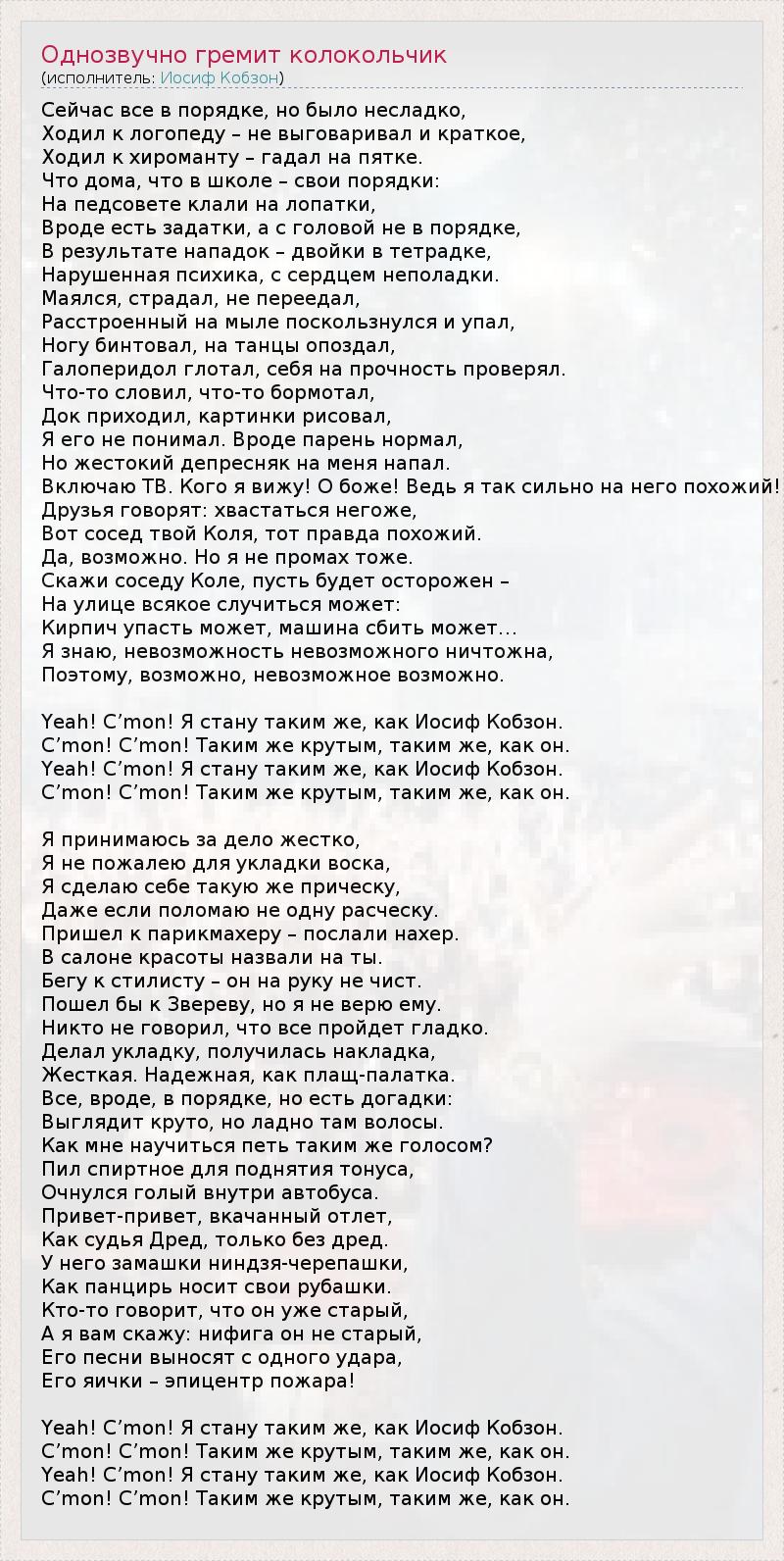 Сейчас все в порядке, но было несладко, Ходил к логопеду – не выговаривал и краткое, Ходил к хироманту – гадал на пятке. Что дома, что в школе – свои порядки: На педсовете клали на лопатки, Вроде есть задатки, а с головой не в порядке, В результате нападок – двойки в тетрадке, Нарушенная психика, с сердцем неполадки. Маялся, страдал, не переедал, Расстроенный на мыле поскользнулся и упал, Ногу бинтовал, на танцы опоздал, Галоперидол глотал, себя на прочность проверял. Что-то словил, что-то бормотал, Док приходил, картинки рисовал, Я его не понимал. Вроде парень нормал, Но жестокий депресняк на меня напал. Включаю ТВ. Кого я вижу! О боже! Ведь я так сильно на него похожий! Друзья говорят: хвастаться негоже, Вот сосед твой Коля, тот правда похожий. Да, возможно. Но я не промах тоже. Скажи соседу Коле, пусть будет осторожен – На улице всякое случиться может: Кирпич упасть может, машина сбить может… Я знаю, невозможность невозможного ничтожна, Поэтому, возможно, невозможное возможно. Yeah! C’mon! Я стану таким же, как Иосиф Кобзон. C’mon! C’mon! Таким же крутым, таким же, как он. Yeah! C’mon! Я стану таким же, как Иосиф Кобзон. C’mon! C’mon! Таким же крутым, таким же, как он. Я принимаюсь за дело жестко, Я не пожалею для укладки воска, Я сделаю себе такую же прическу, Даже если поломаю не одну расческу. Пришел к парикмахеру – послали нахер. В салоне красоты назвали на ты. Бегу к стилисту – он на руку не чист. Пошел бы к Звереву, но я не верю ему. Никто не говорил, что все пройдет гладко. Делал укладку, получилась накладка, Жесткая. Надежная, как плащ-палатка. Все, вроде, в порядке, но есть догадки: Выглядит круто, но ладно там волосы. Как мне научиться петь таким же голосом? Пил спиртное для поднятия тонуса, Очнулся голый внутри автобуса. Привет-привет, вкачанный отлет, Как судья Дред, только без дред. У него замашки ниндзя-черепашки, Как панцирь носит свои рубашки. Кто-то говорит, что он уже старый, А я вам скажу: нифига он не старый, Его песни выносят с одного удара, Его яички – эпицентр пожара! Yeah! C’mon! Я стану таким же, как Иосиф Кобзон. C’mon! C’mon! Таким же крутым, таким же, как он. Yeah! C’mon! Я стану таким же, как Иосиф Кобзон. C’mon! C’mon! Таким же крутым, таким же, как он.