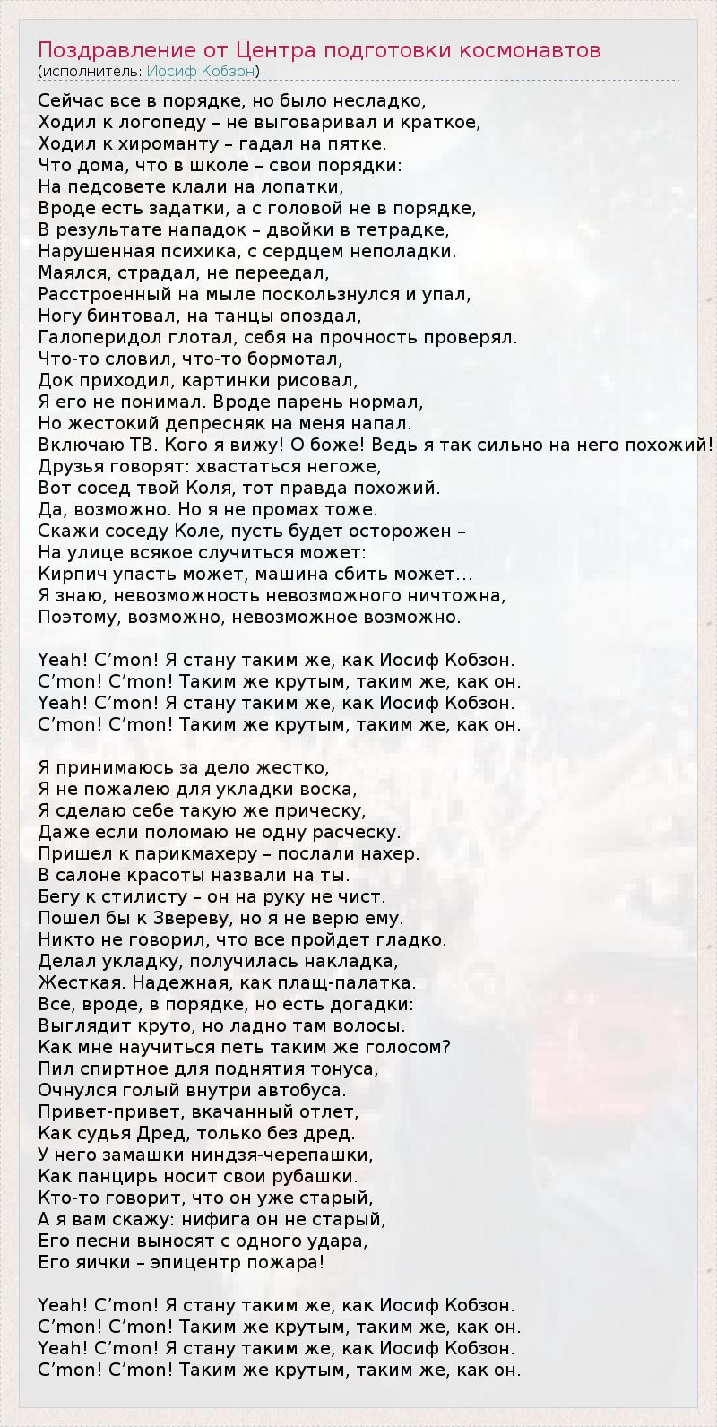 Сейчас все в порядке, но было несладко, Ходил к логопеду – не выговаривал и краткое, Ходил к хироманту – гадал на пятке. Что дома, что в школе – свои порядки: На педсовете клали на лопатки, Вроде есть задатки, а с головой не в порядке, В результате нападок – двойки в тетрадке, Нарушенная психика, с сердцем неполадки. Маялся, страдал, не переедал, Расстроенный на мыле поскользнулся и упал, Ногу бинтовал, на танцы опоздал, Галоперидол глотал, себя на прочность проверял. Что-то словил, что-то бормотал, Док приходил, картинки рисовал, Я его не понимал. Вроде парень нормал, Но жестокий депресняк на меня напал. Включаю ТВ. Кого я вижу! О боже! Ведь я так сильно на него похожий! Друзья говорят: хвастаться негоже, Вот сосед твой Коля, тот правда похожий. Да, возможно. Но я не промах тоже. Скажи соседу Коле, пусть будет осторожен – На улице всякое случиться может: Кирпич упасть может, машина сбить может… Я знаю, невозможность невозможного ничтожна, Поэтому, возможно, невозможное возможно. Yeah! C’mon! Я стану таким же, как Иосиф Кобзон. C’mon! C’mon! Таким же крутым, таким же, как он. Yeah! C’mon! Я стану таким же, как Иосиф Кобзон. C’mon! C’mon! Таким же крутым, таким же, как он. Я принимаюсь за дело жестко, Я не пожалею для укладки воска, Я сделаю себе такую же прическу, Даже если поломаю не одну расческу. Пришел к парикмахеру – послали нахер. В салоне красоты назвали на ты. Бегу к стилисту – он на руку не чист. Пошел бы к Звереву, но я не верю ему. Никто не говорил, что все пройдет гладко. Делал укладку, получилась накладка, Жесткая. Надежная, как плащ-палатка. Все, вроде, в порядке, но есть догадки: Выглядит круто, но ладно там волосы. Как мне научиться петь таким же голосом? Пил спиртное для поднятия тонуса, Очнулся голый внутри автобуса. Привет-привет, вкачанный отлет, Как судья Дред, только без дред. У него замашки ниндзя-черепашки, Как панцирь носит свои рубашки. Кто-то говорит, что он уже старый, А я вам скажу: нифига он не старый, Его песни выносят с одного удара, Его яички – эпицентр пожара! Yeah! C’mon! Я стану таким же, как Иосиф Кобзон. C’mon! C’mon! Таким же крутым, таким же, как он. Yeah! C’mon! Я стану таким же, как Иосиф Кобзон. C’mon! C’mon! Таким же крутым, таким же, как он.