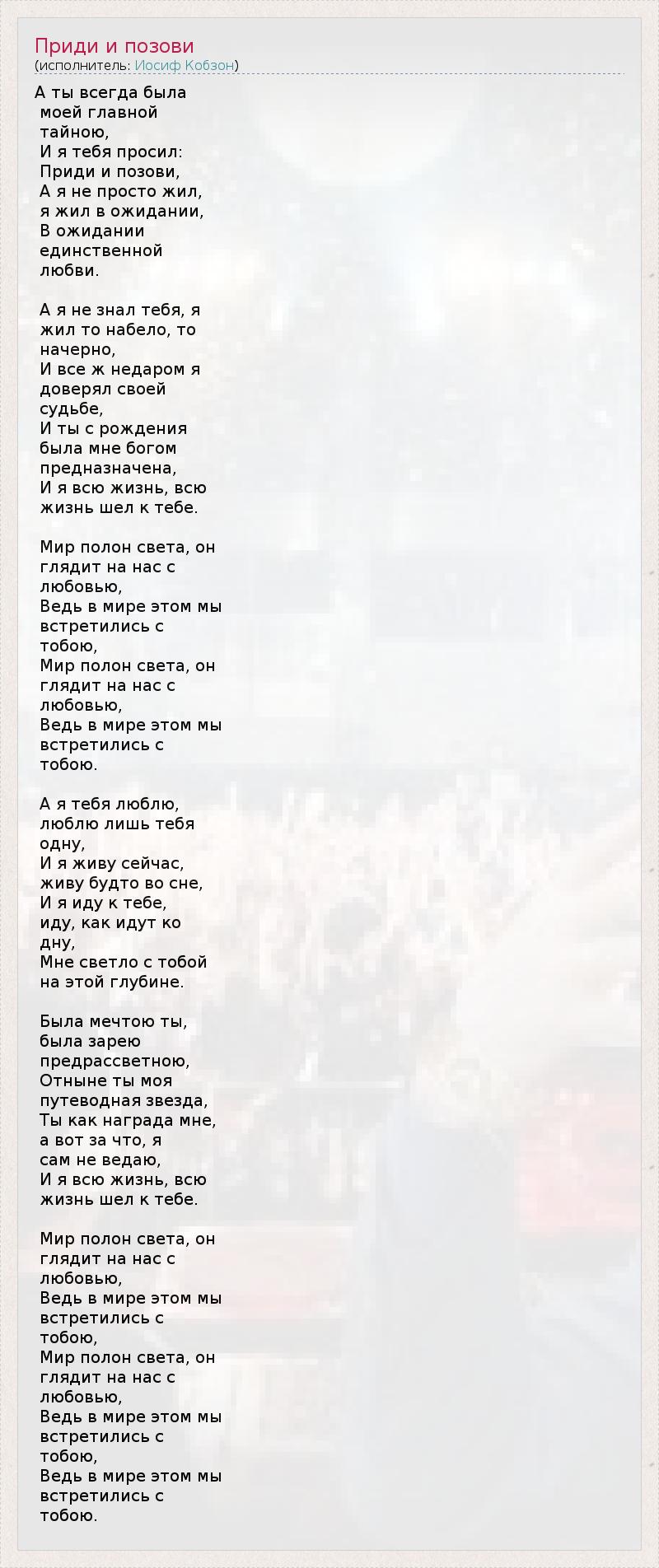 А ты всегда была моей главной тайною, И я тебя просил: Приди и позови, А я не просто жил, я жил в ожидании, В ожидании единственной любви. А я не знал тебя, я жил то набело, то начерно, И все ж недаром я доверял своей судьбе, И ты с рождения была мне богом предназначена, И я всю жизнь, всю жизнь шел к тебе. Мир полон света, он глядит на нас с любовью, Ведь в мире этом мы встретились с тобою, Мир полон света, он глядит на нас с любовью, Ведь в мире этом мы встретились с тобою. А я тебя люблю, люблю лишь тебя одну, И я живу сейчас, живу будто во сне, И я иду к тебе, иду, как идут ко дну, Мне светло с тобой на этой глубине. Была мечтою ты, была зарею предрассветною, Отныне ты моя путеводная звезда, Ты как награда мне, а вот за что, я сам не ведаю, И я всю жизнь, всю жизнь шел к тебе. Мир полон света, он глядит на нас с любовью, Ведь в мире этом мы встретились с тобою, Мир полон света, он глядит на нас с любовью, Ведь в мире этом мы встретились с тобою, Ведь в мире этом мы встретились с тобою.