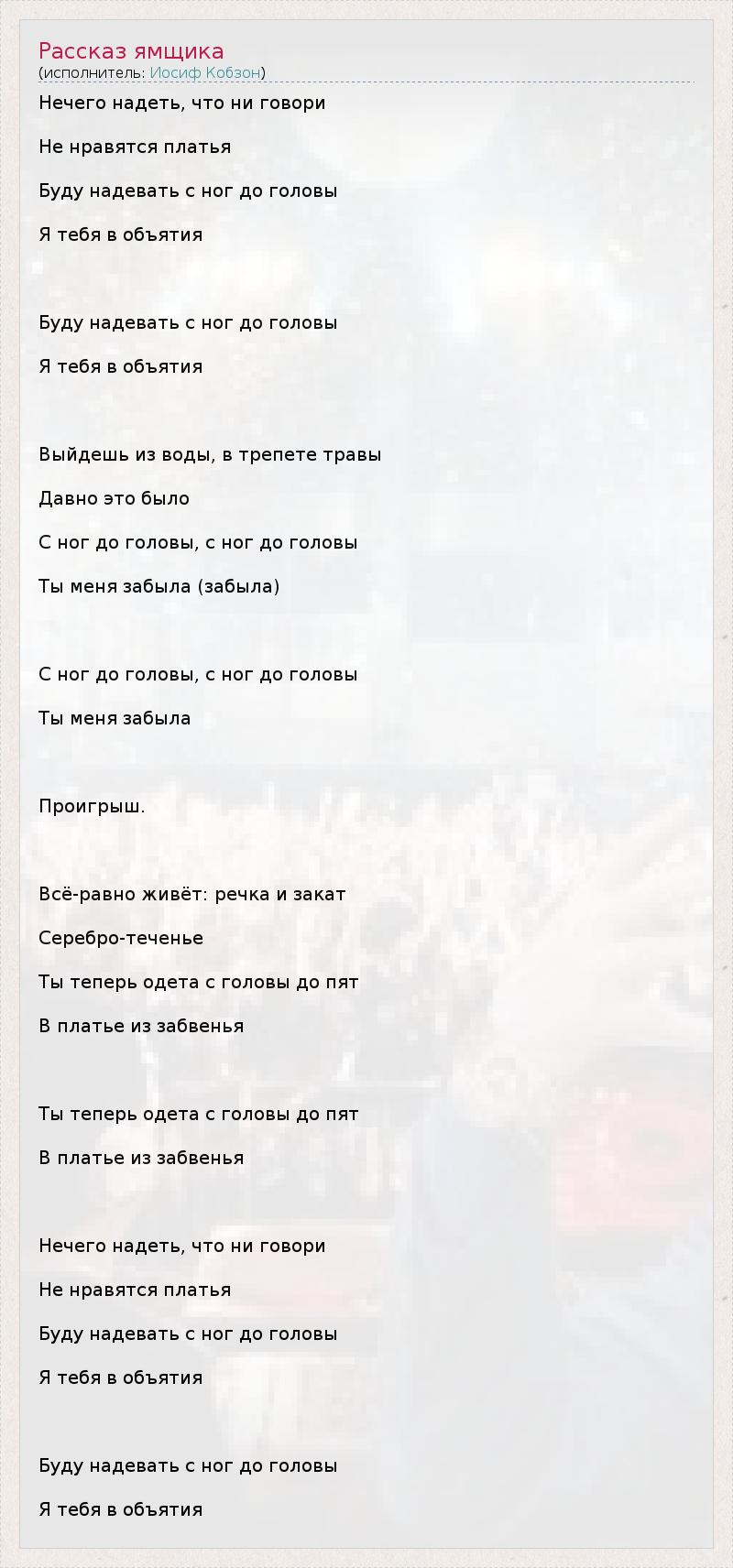 Нечего надеть, что ни говори Не нравятся платья Буду надевать с ног до головы Я тебя в объятия Буду надевать с ног до головы Я тебя в объятия Выйдешь из воды, в трепете травы Давно это было С ног до головы, с ног до головы Ты меня забыла (забыла) С ног до головы, с ног до головы Ты меня забыла Проигрыш. Всё-равно живёт: речка и закат Серебро-теченье Ты теперь одета с головы до пят В платье из забвенья Ты теперь одета с головы до пят В платье из забвенья Нечего надеть, что ни говори Не нравятся платья Буду надевать с ног до головы Я тебя в объятия Буду надевать с ног до головы Я тебя в объятия