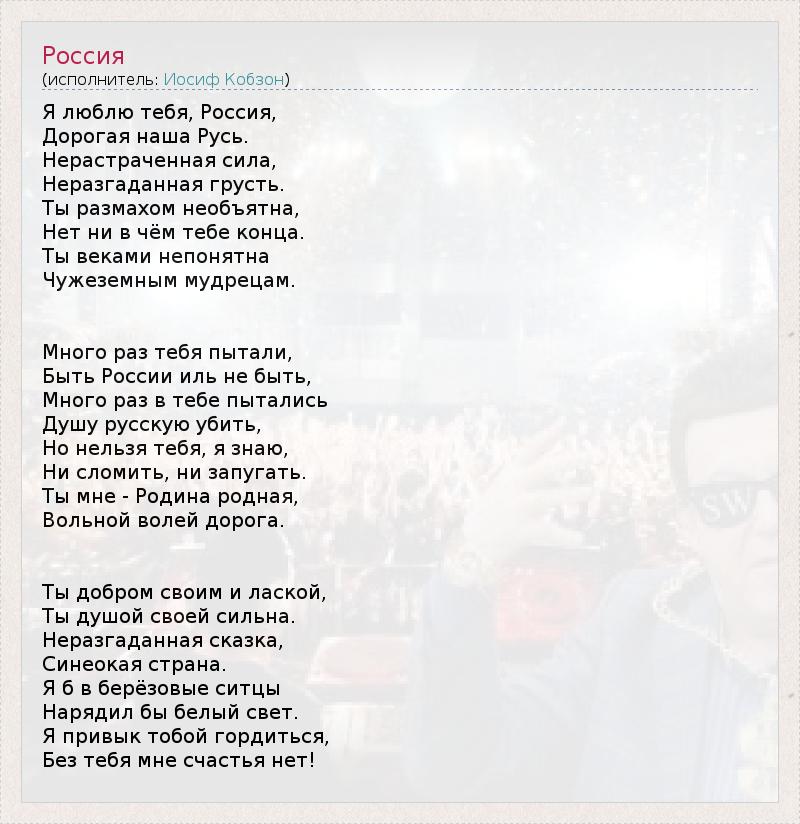 Я люблю тебя, Россия, Дорогая наша Русь. Нерастраченная сила, Неразгаданная грусть. Ты размахом необъятна, Нет ни в чём тебе конца. Ты веками непонятна Чужеземным мудрецам. Много раз тебя пытали, Быть России иль не быть, Много раз в тебе пытались Душу русскую убить, Но нельзя тебя, я знаю, Ни сломить, ни запугать. Ты мне - Родина родная, Вольной волей дорога. Ты добром своим и лаской, Ты душой своей сильна. Неразгаданная сказка, Синеокая страна. Я б в берёзовые ситцы Нарядил бы белый свет. Я привык тобой гордиться, Без тебя мне счастья нет!