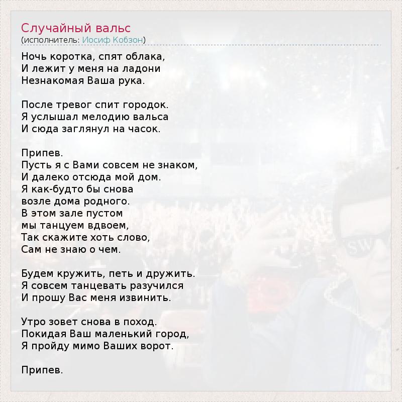 Ночь коротка, спят облака, И лежит у меня на ладони Незнакомая Ваша рука. После тревог спит городок. Я услышал мелодию вальса И сюда заглянул на часок. Припев. Пусть я с Вами совсем не знаком, И далеко отсюда мой дом. Я как-будто бы снова возле дома родного. В этом зале пустом мы танцуем вдвоем, Так скажите хоть слово, Сам не знаю о чем. Будем кружить, петь и дружить. Я совсем танцевать разучился И прошу Вас меня извинить. Утро зовет снова в поход. Покидая Ваш маленький город, Я пройду мимо Ваших ворот. Припев.