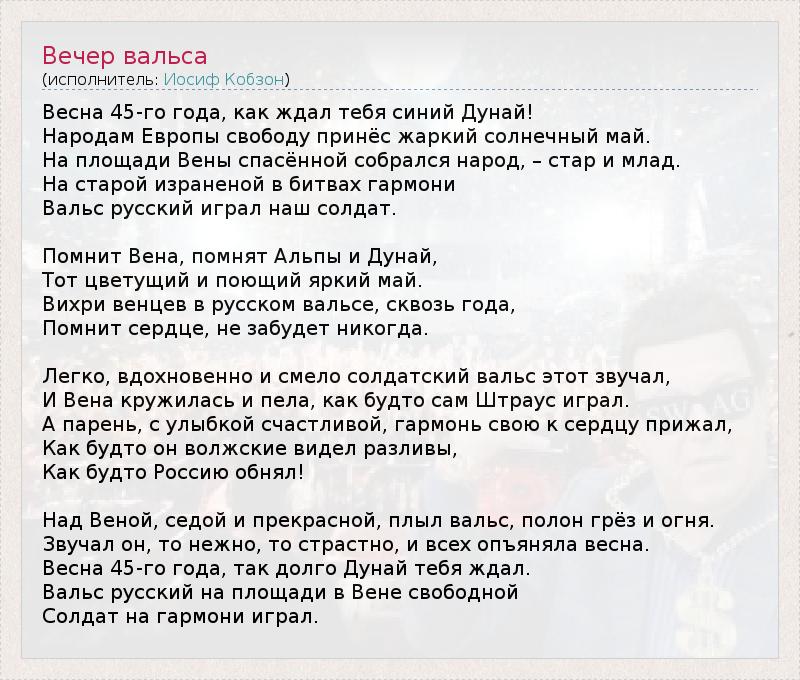 Весна 45-го года, как ждал тебя синий Дунай! Народам Европы свободу принёс жаркий солнечный май. На площади Вены спасённой собрался народ, – стар и млад. На старой израненой в битвах гармони Вальс русский играл наш солдат. Помнит Вена, помнят Альпы и Дунай, Тот цветущий и поющий яркий май. Вихри венцев в русском вальсе, сквозь года, Помнит сердце, не забудет никогда. Легко, вдохновенно и смело солдатский вальс этот звучал, И Вена кружилась и пела, как будто сам Штраус играл. А парень, с улыбкой счастливой, гармонь свою к сердцу прижал, Как будто он волжские видел разливы, Как будто Россию обнял! Над Веной, седой и прекрасной, плыл вальс, полон грёз и огня. Звучал он, то нежно, то страстно, и всех опъяняла весна. Весна 45-го года, так долго Дунай тебя ждал. Вальс русский на площади в Вене свободной Солдат на гармони играл.