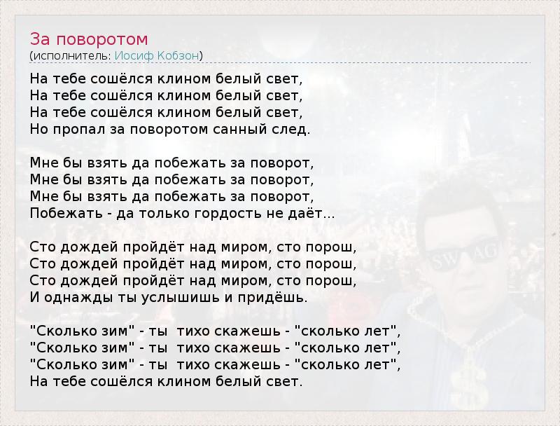 На тебе сошёлся клином белый свет, На тебе сошёлся клином белый свет, На тебе сошёлся клином белый свет, Но пропал за поворотом санный след. Мне бы взять да побежать за поворот, Мне бы взять да побежать за поворот, Мне бы взять да побежать за поворот, Побежать - да только гордость не даёт... Сто дождей пройдёт над миром, сто порош, Сто дождей пройдёт над миром, сто порош, Сто дождей пройдёт над миром, сто порош, И однажды ты услышишь и придёшь. "Сколько зим" - ты тихо скажешь - "сколько лет", "Сколько зим" - ты тихо скажешь - "сколько лет", "Сколько зим" - ты тихо скажешь - "сколько лет", На тебе сошёлся клином белый свет.
