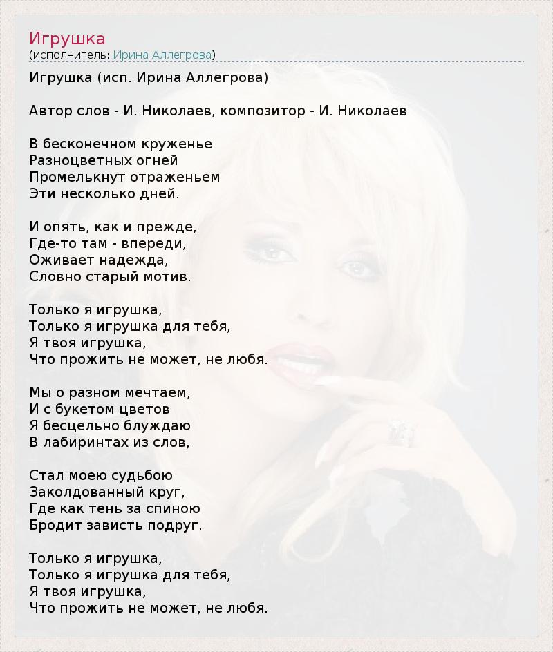 Это интересно:Аллегрова Ирина АлександровнаРодилась в Ростове-на-Дону 20 января.Выросла в актерской семье.После переезда семьи из Ростова-на Дону в Баку, Ирина Аллегрова получила музыкальное образование в Центральной Музыкальной Школе при Бакинской Консерватории (специальность - пианист-концертмейстер).Творческая карьера началась в Театре песни Рашида Бейбутова, народного артиста... продолжение