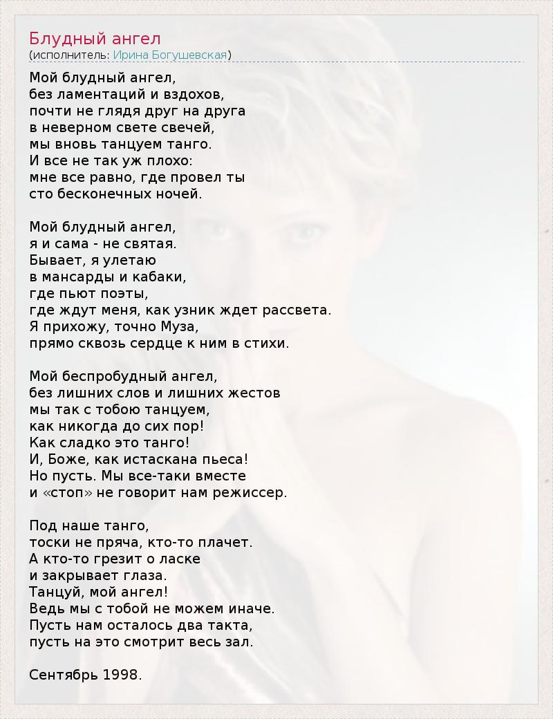 Мой блудный ангел, без ламентаций и вздохов, почти не глядя друг на друга в неверном свете свечей, мы вновь танцуем танго. И все не так уж плохо: мне все равно, где провел ты сто бесконечных ночей. Мой блудный ангел, я и сама - не святая. Бывает, я улетаю в мансарды и кабаки, где пьют поэты, где ждут меня, как узник ждет рассвета. Я прихожу, точно Муза, прямо сквозь сердце к ним в стихи. Мой беспробудный ангел, без лишних слов и лишних жестов мы так с тобою танцуем, как никогда до сих пор! Как сладко это танго! И, Боже, как истаскана пьеса! Но пусть. Мы все-таки вместе и «стоп» не говорит нам режиссер. Под наше танго, тоски не пряча, кто-то плачет. А кто-то грезит о ласке и закрывает глаза. Танцуй, мой ангел! Ведь мы с тобой не можем иначе. Пусть нам осталось два такта, пусть на это смотрит весь зал. Сентябрь 1998.
