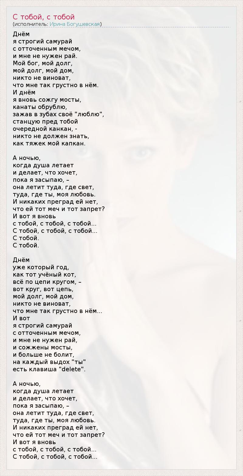 Днём я строгий самурай с отточенным мечом, и мне не нужен рай. Мой бог, мой долг, мой долг, мой дом, никто не виноват, что мне так грустно в нём. И днём я вновь сожгу мосты, канаты обрублю, зажав в зубах своё "люблю", станцую пред тобой очередной канкан, - никто не должен знать, как тяжек мой капкан. А ночью, когда душа летает и делает, что хочет, пока я засыпаю, – она летит туда, где свет, туда, где ты, моя любовь. И никаких преград ей нет, что ей тот меч и тот запрет? И вот я вновь с тобой, с тобой, с тобой... С тобой, с тобой, с тобой... С тобой. С тобой. Днём уже который год, как тот учёный кот, всё по цепи кругом, – вот круг, вот цепь, мой долг, мой дом, никто не виноват, что мне так грустно в нём... И вот я строгий самурай с отточенным мечом, и мне не нужен рай, и сожжены мосты, и больше не болит, на каждый выдох "ты" есть клавиша "delete". А ночью, когда душа летает и делает, что хочет, пока я засыпаю, – она летит туда, где свет, туда, где ты, моя любовь. И никаких преград ей нет, что ей тот меч и тот запрет? И вот я вновь с тобой, с тобой, с тобой... С тобой, с тобой, с тобой...