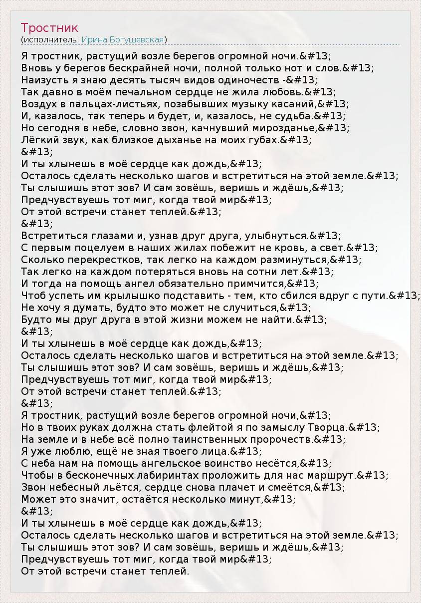 Это интересно:Певица Ирина Богушевская закончила философский факультет МГУ. Во время учебы принимала участие в спектаклях легендарного Студенческого театра МГУ вместе с Алексеем Кортневым и Валдисом Пельшем. В 1993-м стала обладательницей Гран-при фестиваля актерской песни имени Андрея Миронова. Выступала совместно с группой «Несчастный случай», вышла замуж за Алексея Кортнева. В 1993 году попала... продолжение