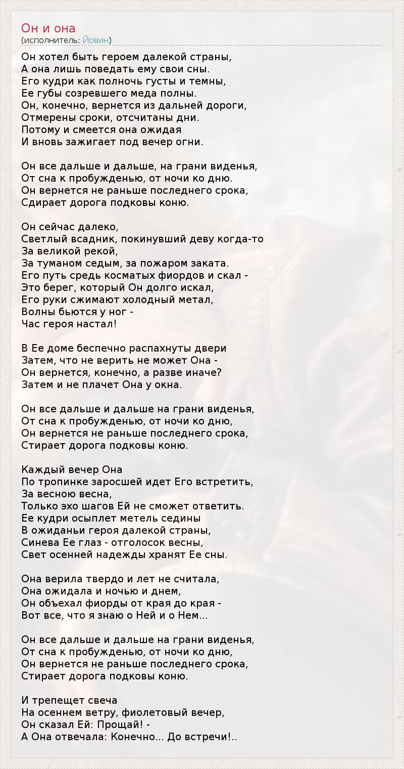 Тэм Йовин — Он и она Он хотел быть героем далёкой страны А она лишь поведать ему свои сны Её кудри как полночь густы и темны Ёё кудри созревшего мёда полны Он конечно вернётся Из дальней дороги Отмеряны сроки Подсчитаны дни Потому и смеётся она, ожидая Его, зажигая под вечер огни Он всё дальше и дальше... на грани виденья От сна к пробужденью, от ночи ко дню Он вернётся не раньше последнего срока Стирает дорога подковы коню... Он сейчас далеко Светлый всадник покинувший деву когда-то За великой рекой, за туманом седым За пожаром заката Его путь средь косматых фьордов и скал Это берег, который он долго искал Его руки сжимают холодный металл Волны бьются у ног Час героя настал! В её доме беспечно распахнуты двери Затем что не верить не может она Он вернётся конечно! А разве иначе? Затем и не плачет она у окна... Он всё дальше и дальше... на грани виденья От сна к пробужденью, от ночи ко дню Он вернётся не раньше последнего срока Стирает дорога подковы коню... Каждый вечер она по тропинке заросшей идёт его встретить За весною весна Только эхо шагов ей не сможет ответить Её кудри осыплет метель седины В ожиданьи героя далёкой страны Синева её глаз - отголосок весны Цвет осенней надежды хранят её сны... Она верила твёрдо и век не считала Она ожидала и ночью и днём Он объехал все фьорды от края до края, Вот и всё, что я знаю о ней и о нём... Он всё дальше и дальше... на грани виденья От сна к пробужденью, от ночи ко дню Он вернётся не раньше последнего срока Стирает дорога подковы коню... И трепещет свеча На осеннем ветру фиолетовый вечер... Он сказал ей прощай... А она отвечала: Конечно... и до встречи.