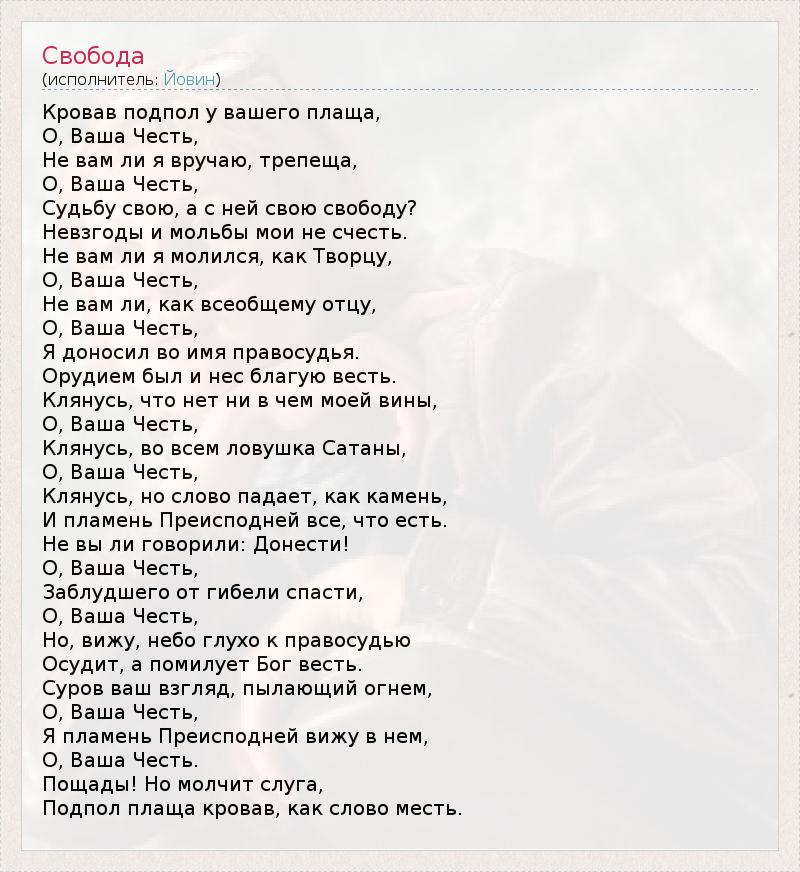 Кровав подпол у вашего плаща, О, Ваша Честь, Не вам ли я вручаю, трепеща, О, Ваша Честь, Судьбу свою, а с ней свою свободу? Невзгоды и мольбы мои не счесть. Не вам ли я молился, как Творцу, О, Ваша Честь, Не вам ли, как всеобщему отцу, О, Ваша Честь, Я доносил во имя правосудья. Орудием был и нес благую весть. Клянусь, что нет ни в чем моей вины, О, Ваша Честь, Клянусь, во всем ловушка Сатаны, О, Ваша Честь, Клянусь, но слово падает, как камень, И пламень Преисподней все, что есть. Не вы ли говорили: Донести! О, Ваша Честь, Заблудшего от гибели спасти, О, Ваша Честь, Но, вижу, небо глухо к правосудью Осудит, а помилует Бог весть. Суров ваш взгляд, пылающий огнем, О, Ваша Честь, Я пламень Преисподней вижу в нем, О, Ваша Честь. Пощады! Но молчит слуга, Подпол плаща кровав, как слово месть.