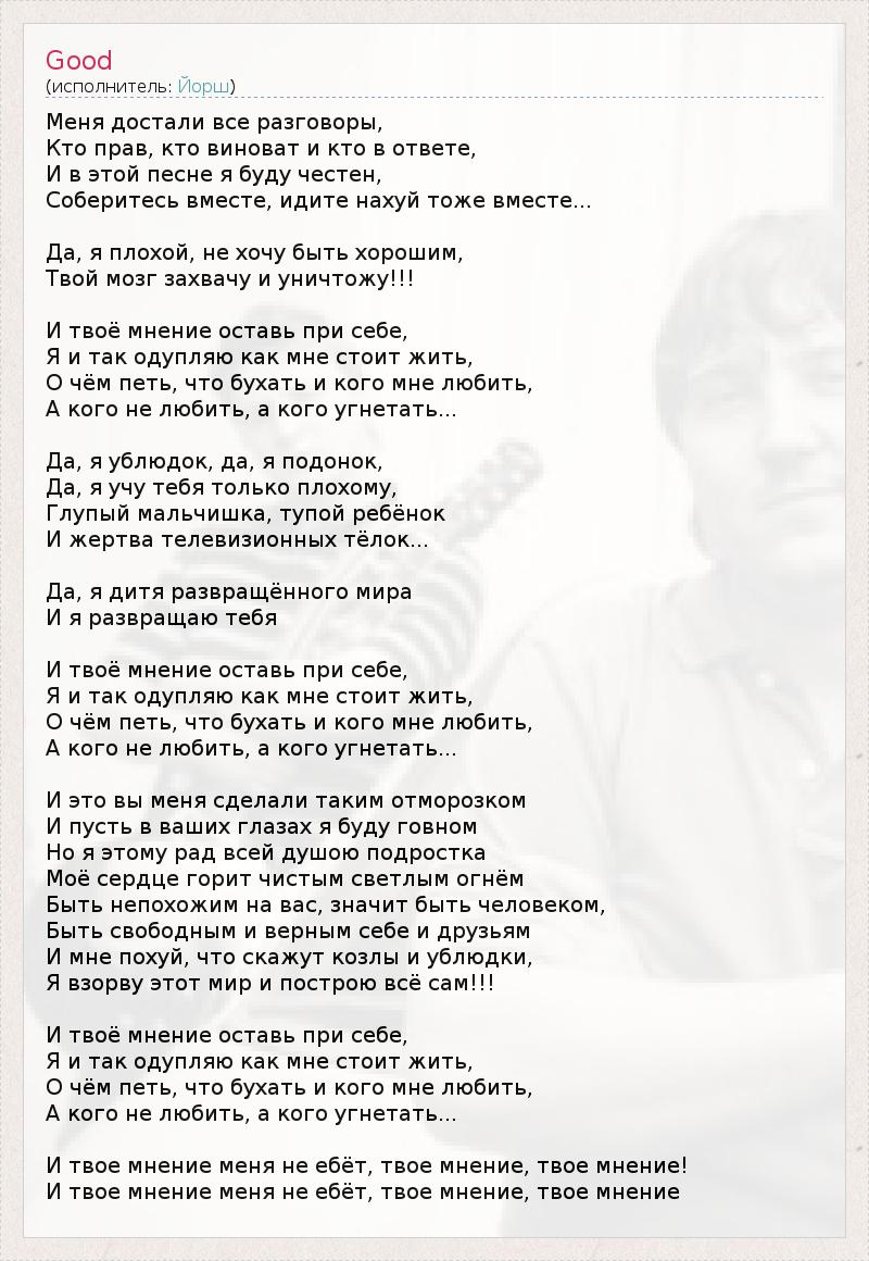 Меня достали все разговоры, Кто прав, кто виноват и кто в ответе, И в этой песне я буду честен, Соберитесь вместе, идите нахуй тоже вместе... Да, я плохой, не хочу быть хорошим, Твой мозг захвачу и уничтожу!!! И твоё мнение оставь при себе, Я и так одупляю как мне стоит жить, О чём петь, что бухать и кого мне любить, А кого не любить, а кого угнетать... Да, я ублюдок, да, я подонок, Да, я учу тебя только плохому, Глупый мальчишка, тупой ребёнок И жертва телевизионных тёлок... Да, я дитя развращённого мира И я развращаю тебя И твоё мнение оставь при себе, Я и так одупляю как мне стоит жить, О чём петь, что бухать и кого мне любить, А кого не любить, а кого угнетать... И это вы меня сделали таким отморозком И пусть в ваших глазах я буду говном Но я этому рад всей душою подростка Моё сердце горит чистым светлым огнём Быть непохожим на вас, значит быть человеком, Быть свободным и верным себе и друзьям И мне похуй, что скажут козлы и ублюдки, Я взорву этот мир и построю всё сам!!! И твоё мнение оставь при себе, Я и так одупляю как мне стоит жить, О чём петь, что бухать и кого мне любить, А кого не любить, а кого угнетать... И твое мнение меня не ебёт, твое мнение, твое мнение! И твое мнение меня не ебёт, твое мнение, твое мнение
