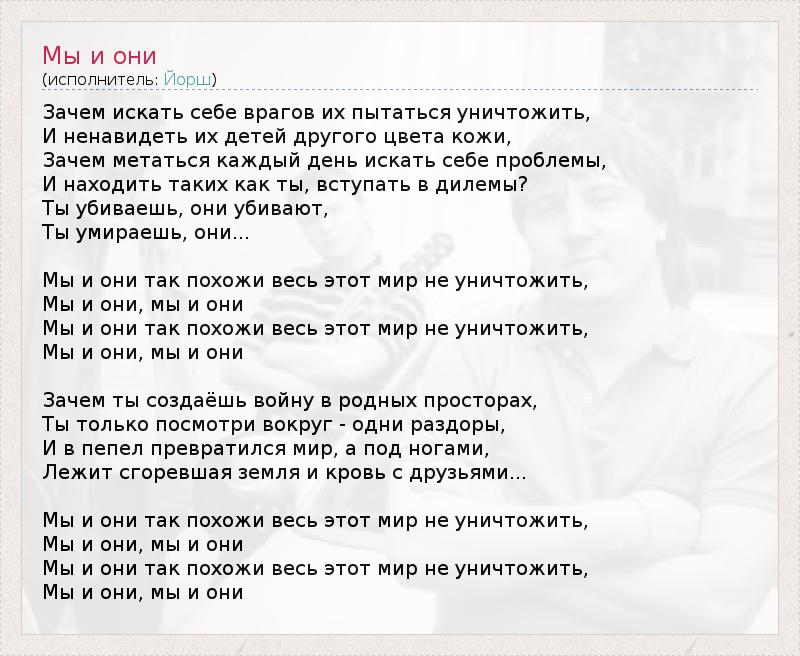 Зачем искать себе врагов их пытаться уничтожить, И ненавидеть их детей другого цвета кожи, Зачем метаться каждый день искать себе проблемы, И находить таких как ты, вступать в дилемы? Ты убиваешь, они убивают, Ты умираешь, они... Мы и они так похожи весь этот мир не уничтожить, Мы и они, мы и они Мы и они так похожи весь этот мир не уничтожить, Мы и они, мы и они Зачем ты создаёшь войну в родных просторах, Ты только посмотри вокруг - одни раздоры, И в пепел превратился мир, а под ногами, Лежит сгоревшая земля и кровь с друзьями... Мы и они так похожи весь этот мир не уничтожить, Мы и они, мы и они Мы и они так похожи весь этот мир не уничтожить, Мы и они, мы и они Йорш - Мы и они - Текст песни, слушать онлайн Йорш - Мы и они - Текст песни, слушать онлайн