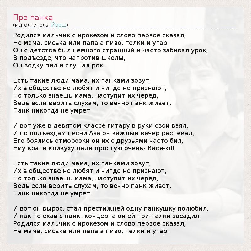Родился мальчик с ирокезом и слово первое сказал, Не мама, сиська или папа,а пиво, телки и угар, Он с детства был немного странный и часто забивал урок, В подъезде, что напротив школы, Он водку пил и слушал рок Есть такие люди мама, их панками зовут, Их в обществе не любят и нигде не признают, Но только знаешь мама, наступит их черед, Ведь если верить слухам, то вечно панк живет, Панк никогда не умрет И вот уже в девятом классе гитару в руки свои взял, И по подъездам песни Аза он каждый вечер распевал, Его боялись отморозки он их с друзьями часто бил, Ему враги кликуху дали простую очень- Вася-kill Есть такие люди мама, их панками зовут, Их в обществе не любят и нигде не признают, Но только знаешь мама, наступит их черед, Ведь если верить слухам, то вечно панк живет, Панк никогда не умрет. И вот он вырос, стал престижней одну панкушку полюбил, И как-то ехав с панк- концерта он ей три палки засадил, Родился мальчик с ирокезом и слово первое сказал, Не мама, сиська или папа,а пиво, телки и угар. Йорш - Про панка - Текст песни, слушать онлайн Йорш - Про панка - Текст песни, слушать онлайн