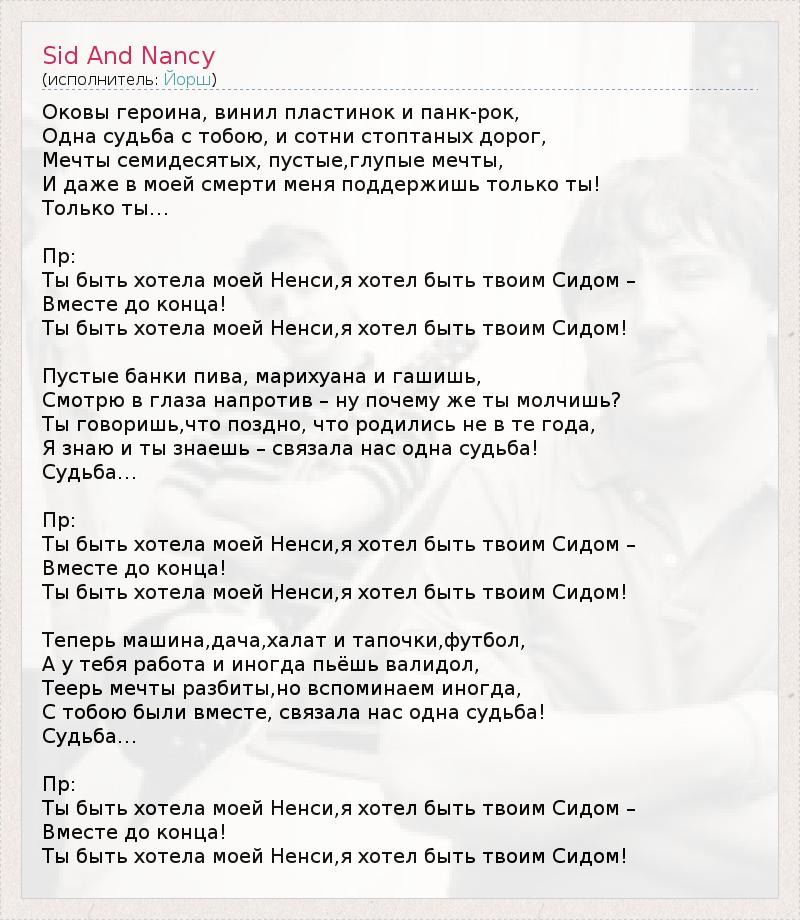 Оковы героина, винил пластинок и панк-рок, Одна судьба с тобою, и сотни стоптаных дорог, Мечты семидесятых, пустые,глупые мечты, И даже в моей смерти меня поддержишь только ты! Только ты… Пр: Ты быть хотела моей Ненси,я хотел быть твоим Сидом – Вместе до конца! Ты быть хотела моей Ненси,я хотел быть твоим Сидом! Пустые банки пива, марихуана и гашишь, Смотрю в глаза напротив – ну почему же ты молчишь? Ты говоришь,что поздно, что родились не в те года, Я знаю и ты знаешь – связала нас одна судьба! Судьба… Пр: Ты быть хотела моей Ненси,я хотел быть твоим Сидом – Вместе до конца! Ты быть хотела моей Ненси,я хотел быть твоим Сидом! Теперь машина,дача,халат и тапочки,футбол, А у тебя работа и иногда пьёшь валидол, Теерь мечты разбиты,но вспоминаем иногда, С тобою были вместе, связала нас одна судьба! Судьба… Пр: Ты быть хотела моей Ненси,я хотел быть твоим Сидом – Вместе до конца! Ты быть хотела моей Ненси,я хотел быть твоим Сидом!