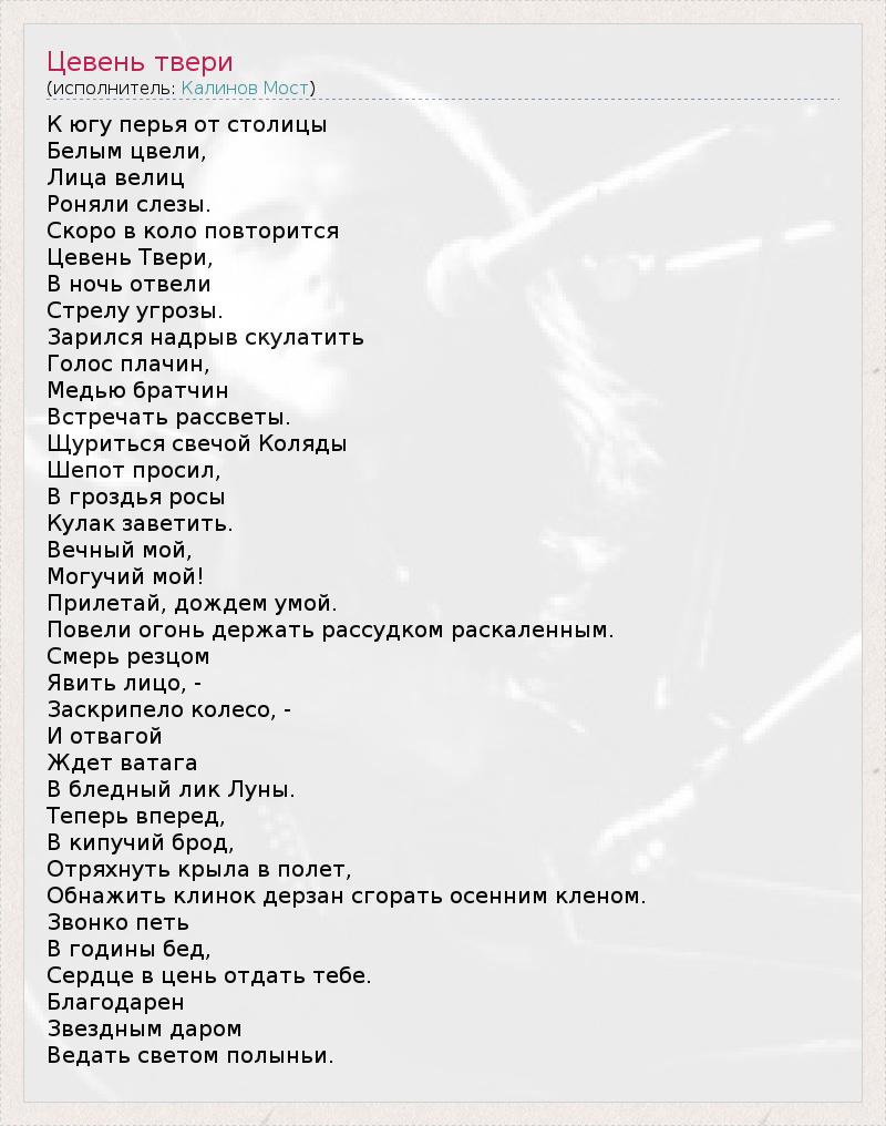 Это интересно:"Калинов Мост" - легендарная сибирская рок-группа (местом рождения самой группы считается город Новосибирск, колыбелью же лидера группы и автора песен - Дмитрия Ревякина - можно считать Забайкалье, где он провёл детство и где до сих пор черпает свои жизненные и творческие силы). Музыкальный стиль группы журналисты чаще всего определяют как фолк-рок. Конечно же, это весьма условно.... продолжение