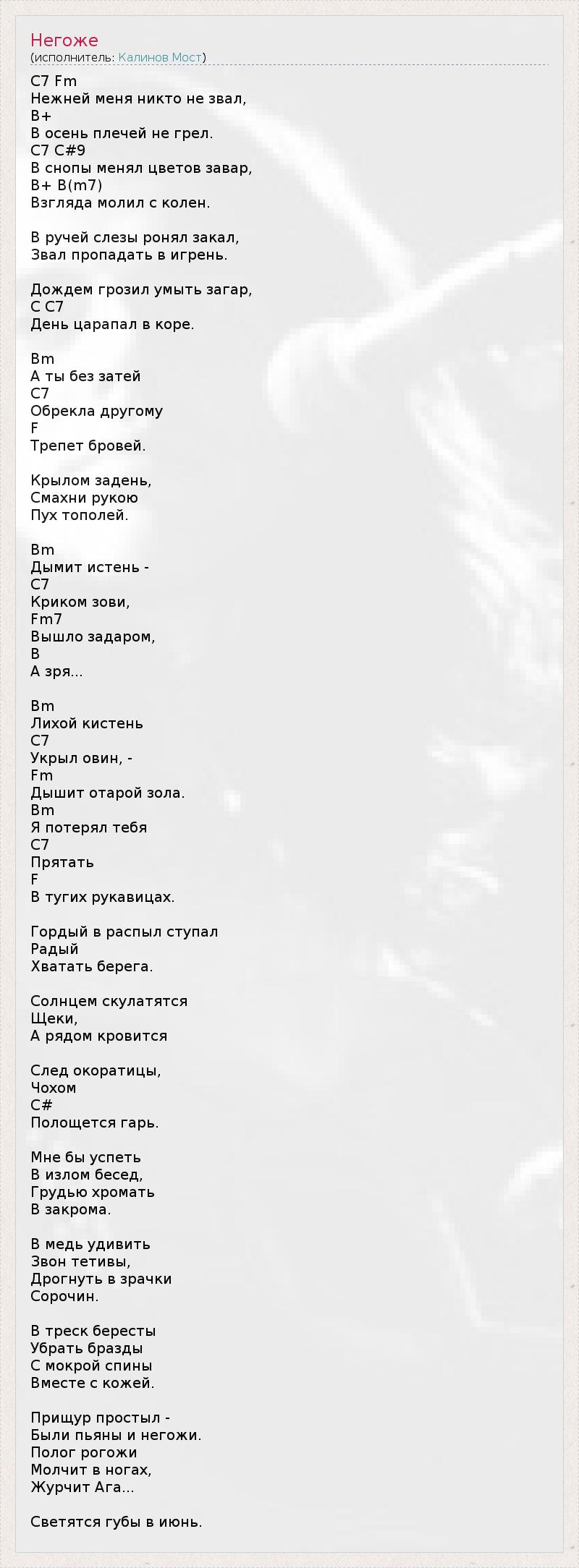 Это интересно:"Калинов Мост" - легендарная сибирская рок-группа (местом рождения самой группы считается город Новосибирск, колыбелью же лидера группы и автора песен - Дмитрия Ревякина - можно считать Забайкалье, где он провёл детство и где до сих пор черпает свои жизненные и творческие силы). Музыкальный стиль группы журналисты чаще всего определяют как фолк-рок. Конечно же, это весьма условно.... продолжение