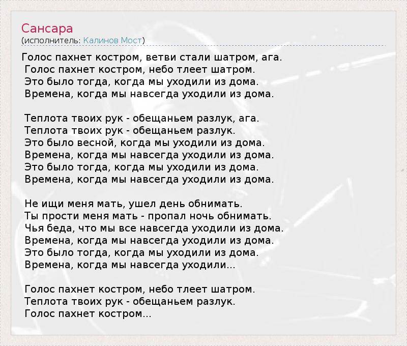 Голос пахнет костром, ветви стали шатром, ага.