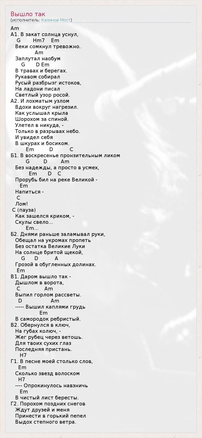 Это интересно:"Калинов Мост" - легендарная сибирская рок-группа (местом рождения самой группы считается город Новосибирск, колыбелью же лидера группы и автора песен - Дмитрия Ревякина - можно считать Забайкалье, где он провёл детство и где до сих пор черпает свои жизненные и творческие силы). Музыкальный стиль группы журналисты чаще всего определяют как фолк-рок. Конечно же, это весьма условно.... продолжение