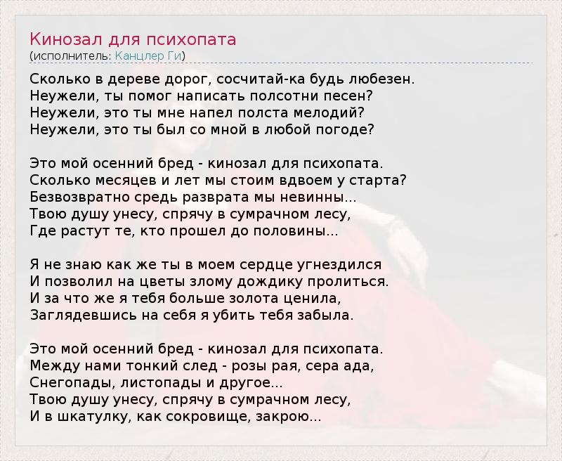 А как ты думаешь, о чем песня "Кинозал для психопата" ?
