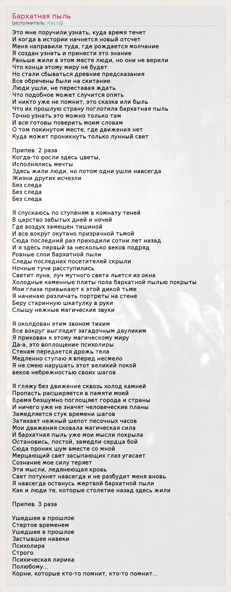 ГлавнаяИсполнителиКастаБархатная пыль