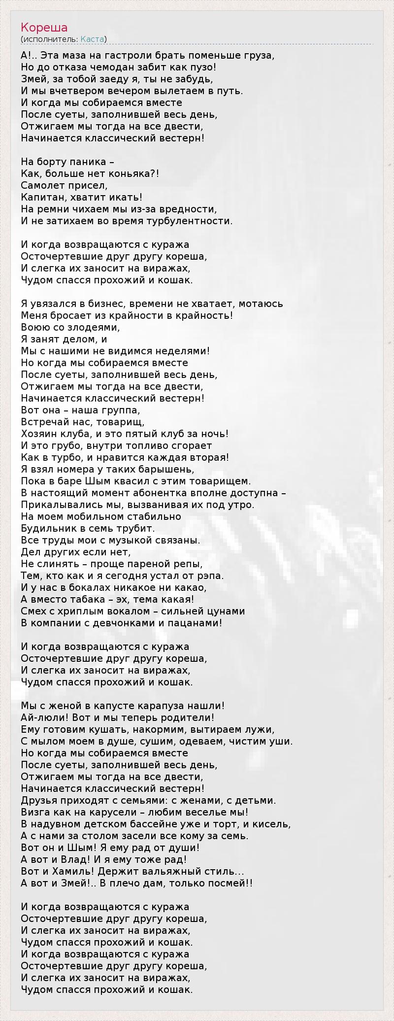 А!.. Эта маза на гастроли брать поменьше груза, Но до отказа чемодан забит как пузо! Змей, за тобой заеду я, ты не забудь, И мы вчетвером вечером вылетаем в путь. И когда мы собираемся вместе После суеты, заполнившей весь день, Отжигаем мы тогда на все двести, Начинается классический вестерн! На борту паника – Как, больше нет коньяка?! Самолет присел, Капитан, хватит икать! На ремни чихаем мы из-за вредности, И не затихаем во время турбулентности. И когда возвращаются с куража Осточертевшие друг другу кореша, И слегка их заносит на виражах, Чудом спасся прохожий и кошак. Я увязался в бизнес, времени не хватает, мотаюсь Меня бросает из крайности в крайность! Воюю со злодеями, Я занят делом, и Мы с нашими не видимся неделями! Но когда мы собираемся вместе После суеты, заполнившей весь день, Отжигаем мы тогда на все двести, Начинается классический вестерн! Вот она – наша группа, Встречай нас, товарищ, Хозяин клуба, и это пятый клуб за ночь! И это грубо, внутри топливо сгорает Как в турбо, и нравится каждая вторая! Я взял номера у таких барышень, Пока в баре Шым квасил с этим товарищем. В настоящий момент абонентка вполне доступна – Прикалывались мы, вызванивая их под утро. На моем мобильном стабильно Будильник в семь трубит. Все труды мои с музыкой связаны. Дел других если нет, Не слинять – проще пареной репы, Тем, кто как и я сегодня устал от рэпа. И у нас в бокалах никакое ни какао, А вместо табака – эх, тема какая! Смех с хриплым вокалом – сильней цунами В компании с девчонками и пацанами! И когда возвращаются с куража Осточертевшие друг другу кореша, И слегка их заносит на виражах, Чудом спасся прохожий и кошак. Мы с женой в капусте карапуза нашли! Ай-люли! Вот и мы теперь родители! Ему готовим кушать, накормим, вытираем лужи, С мылом моем в душе, сушим, одеваем, чистим уши. Но когда мы собираемся вместе После суеты, заполнившей весь день, Отжигаем мы тогда на все двести, Начинается классический вестерн! Друзья приходят с семьями: с женами, с детьми. Визга как на карусели – любим веселье мы! В надувном детском бассейне уже и торт, и кисель, А с нами за столом засели все кому за семь. Вот он и Шым! Я ему рад от души! А вот и Влад! И я ему тоже рад! Вот и Хамиль! Держит вальяжный стиль… А вот и Змей!.. В плечо дам, только посмей!! И когда возвращаются с куража Осточертевшие друг другу кореша, И слегка их заносит на виражах, Чудом спасся прохожий и кошак. И когда возвращаются с куража Осточертевшие друг другу кореша, И слегка их заносит на виражах, Чудом спасся прохожий и кошак.