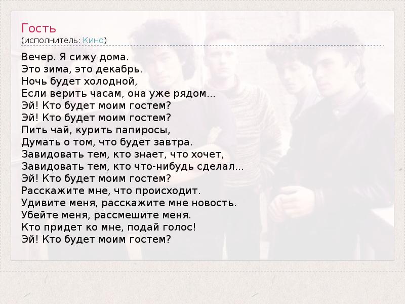 Вечер. Я сижу дома. Это зима, это декабрь. Ночь будет холодной, Если верить часам, она уже рядом... Эй! Кто будет моим гостем? Эй! Кто будет моим гостем? Пить чай, курить папиросы, Думать о том, что будет завтра. Завидовать тем, кто знает, что хочет, Завидовать тем, кто что-нибудь сделал... Эй! Кто будет моим гостем? Расскажите мне, что происходит. Удивите меня, расскажите мне новость. Убейте меня, рассмешите меня. Кто придет ко мне, подай голос! Эй! Кто будет моим гостем?