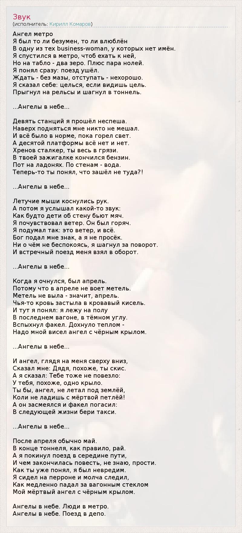 Пользуясь секвенсором, Комаров пропевает-проговаривает все партии, включая партии инструментов. В отличие от звукоимитаторов, звуковой пейзаж создается именно из осмысленных слов, которые варьируются по длительностям и тембровому окрасу. Закольцованные, эти слова вполне заменяют и бас-гитару, и ударные, и клавишные…