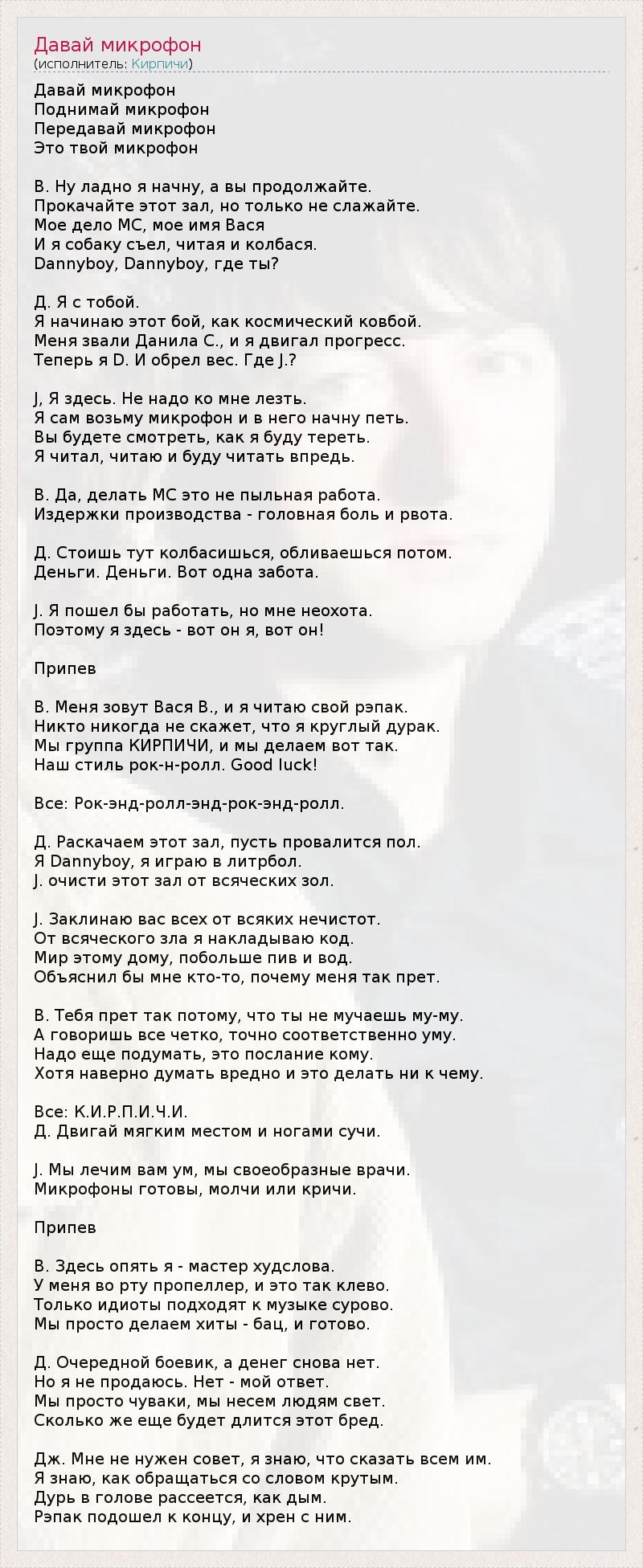 Давай микрофон Поднимай микрофон Передавай микрофон Это твой микрофон В. Ну ладно я начну, а вы продолжайте. Прокачайте этот зал, но только не слажайте. Мое дело МС, мое имя Вася И я собаку съел, читая и колбася. Dannyboy, Dannyboy, где ты? Д. Я с тобой. Я начинаю этот бой, как космический ковбой. Меня звали Данила С., и я двигал прогресс. Теперь я D. И обрел вес. Где J.? J, Я здесь. Не надо ко мне лезть. Я сам возьму микрофон и в него начну петь. Вы будете смотреть, как я буду тереть. Я читал, читаю и буду читать впредь. В. Да, делать МС это не пыльная работа. Издержки производства - головная боль и рвота. Д. Стоишь тут колбасишься, обливаешься потом. Деньги. Деньги. Вот одна забота. J. Я пошел бы работать, но мне неохота. Поэтому я здесь - вот он я, вот он! Припев В. Меня зовут Вася В., и я читаю свой рэпак. Никто никогда не скажет, что я круглый дурак. Мы группа КИРПИЧИ, и мы делаем вот так. Наш стиль рок-н-ролл. Good luck! Все: Рок-энд-ролл-энд-рок-энд-ролл. Д. Раскачаем этот зал, пусть провалится пол. Я Dannyboy, я играю в литрбол. J. очисти этот зал от всяческих зол. J. Заклинаю вас всех от всяких нечистот. От всяческого зла я накладываю код. Мир этому дому, побольше пив и вод. Объяснил бы мне кто-то, почему меня так прет. В. Тебя прет так потому, что ты не мучаешь му-му. А говоришь все четко, точно соответственно уму. Надо еще подумать, это послание кому. Хотя наверно думать вредно и это делать ни к чему. Все: К.И.Р.П.И.Ч.И. Д. Двигай мягким местом и ногами сучи. J. Мы лечим вам ум, мы своеобразные врачи. Микрофоны готовы, молчи или кричи. Припев В. Здесь опять я - мастер худслова. У меня во рту пропеллер, и это так клево. Только идиоты подходят к музыке сурово. Мы просто делаем хиты - бац, и готово. Д. Очередной боевик, а денег снова нет. Но я не продаюсь. Нет - мой ответ. Мы просто чуваки, мы несем людям свет. Сколько же еще будет длится этот бред. Дж. Мне не нужен совет, я знаю, что сказать всем им. Я знаю, как обращаться со словом крутым. Дурь в голове рассеется, как дым. Рэпак подошел к концу, и хрен с ним.