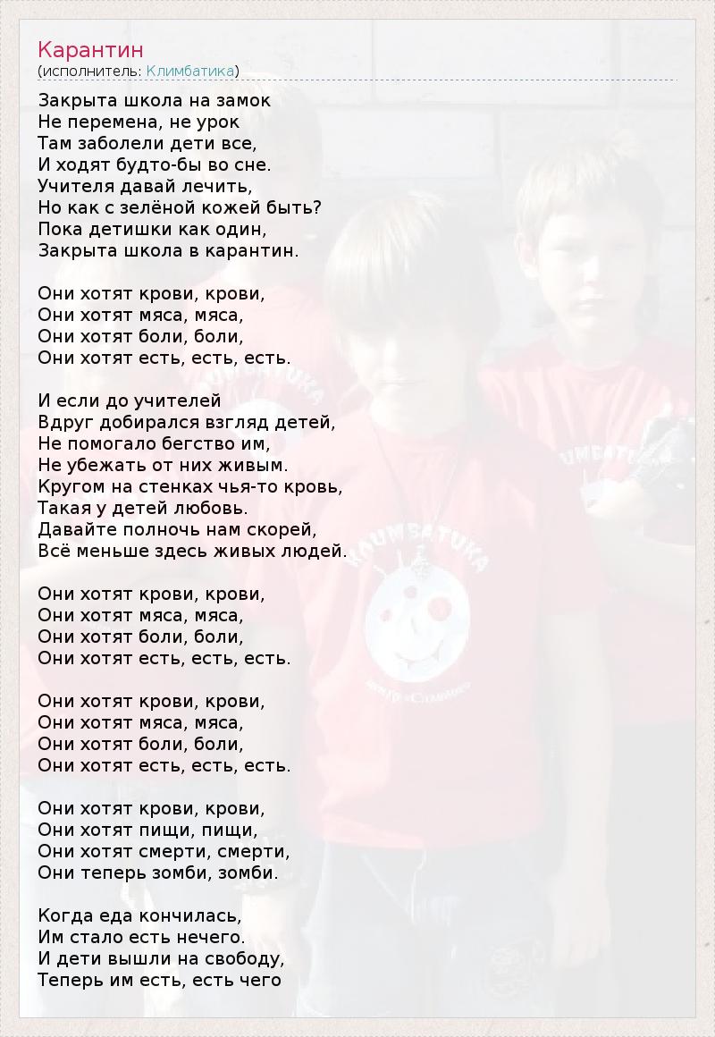 Закрыта школа на замок Не перемена, не урок Там заболели дети все, И ходят будто-бы во сне. Учителя давай лечить, Но как с зелёной кожей быть? Пока детишки как один, Закрыта школа в карантин. Они хотят крови, крови, Они хотят мяса, мяса, Они хотят боли, боли, Они хотят есть, есть, есть. И если до учителей Вдруг добирался взгляд детей, Не помогало бегство им, Не убежать от них живым. Кругом на стенках чья-то кровь, Такая у детей любовь. Давайте полночь нам скорей, Всё меньше здесь живых людей. Они хотят крови, крови, Они хотят мяса, мяса, Они хотят боли, боли, Они хотят есть, есть, есть. Они хотят крови, крови, Они хотят мяса, мяса, Они хотят боли, боли, Они хотят есть, есть, есть. Они хотят крови, крови, Они хотят пищи, пищи, Они хотят смерти, смерти, Они теперь зомби, зомби. Когда еда кончилась, Им стало есть нечего. И дети вышли на свободу, Теперь им есть, есть чего