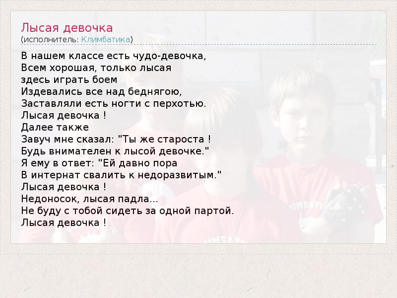 В нашем классе есть чудо-девочка, Всем хорошая, только лысая здесь играть боем Издевались все над беднягою, Заставляли есть ногти с перхотью. Лысая девочка ! Далее также Завуч мне сказал: "Ты же староста ! Будь внимателен к лысой девочке." Я ему в ответ: "Ей давно пора В интернат свалить к недоразвитым." Лысая девочка ! Недоносок, лысая падла... Не буду с тобой сидеть за одной партой. Лысая девочка !