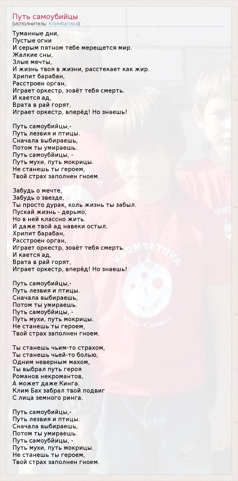 Туманные дни, Пустые огни И серым пятном тебе мерещется мир. Жалкие сны, Злые мечты, И жизнь твоя в жизни, расстекает как жир. Хрипит барабан, Расстроен орган, Играет оркестр, зовёт тебя смерть. И кается ад, Врата в рай горят, Играет оркестр, вперёд! Но знаешь! Путь самоубийцы,- Путь лезвия и птицы. Сначала выбираешь, Потом ты умираешь. Путь самоубйицы, - Путь мухи, путь мокрицы. Не станешь ты героем, Твой страх заполнен гноем. Забудь о мечте, Забудь о звезде, Ты просто дурак, коль жизнь ты забыл. Пускай жизнь - дерьмо, Но в ней классно жить. И даже твой ад навеки остыл. Хрипит барабан, Расстроен орган, Играет оркестр, зовёт тебя смерть. И кается ад, Врата в рай горят, Играет оркестр, вперёд! Но знаешь! Путь самоубийцы,- Путь лезвия и птицы. Сначала выбираешь, Потом ты умираешь. Путь самоубйицы, - Путь мухи, путь мокрицы. Не станешь ты героем, Твой страх заполнен гноем. Ты станешь чьим-то страхом, Ты станешь чьей-то болью, Одним неверным махом, Ты выбрал путь героя Романов некромантов, А может даже Кинга. Клим Бах забрал твой подвиг С лица земного ринга. Путь самоубийцы,- Путь лезвия и птицы. Сначала выбираешь, Потом ты умираешь. Путь самоубйицы, - Путь мухи, путь мокрицы. Не станешь ты героем, Твой страх заполнен гноем.