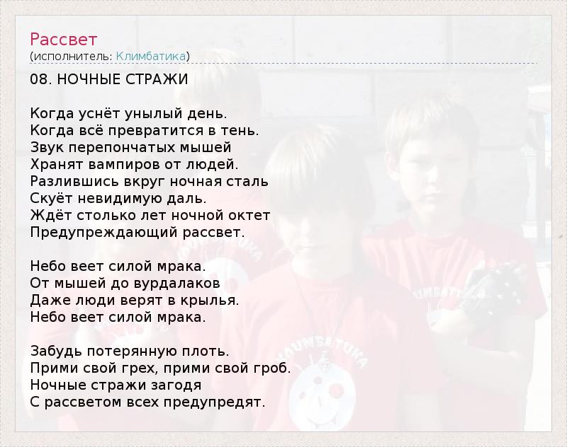 08. Night Watch When fall asleep dull day. When it turns into a shadow. Sound webbed mice Store vampires from humans. Spilling round the night steel Skuёt invisible distance. Waiting for the night so many years octet Warning dawn. Sky blowing force of darkness . From mice to ghouls Even people who believe in the wings. Sky blowing force of darkness . Forget lost flesh. Take your sin , accept his coffin . Night guards ahead With the dawn of alert .