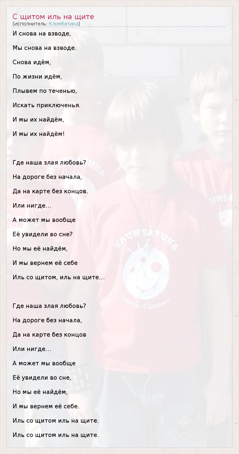 И снова на взводе, Мы снова на взводе. Снова идём, По жизни идём, Плывем по теченью, Искать приключенья. И мы их найдём, И мы их найдём! Где наша злая любовь? На дороге без начала, Да на карте без концов. Или нигде… А может мы вообще Её увидели во сне? Но мы её найдём, И мы вернем её себе Иль со щитом, иль на щите… Где наша злая любовь? На дороге без начала, Да на карте без концов Или нигде… А может мы вообще Её увидели во сне, Но мы её найдём, И мы вернем её себе. Иль со щитом иль на щите. Иль со щитом иль на щите.
