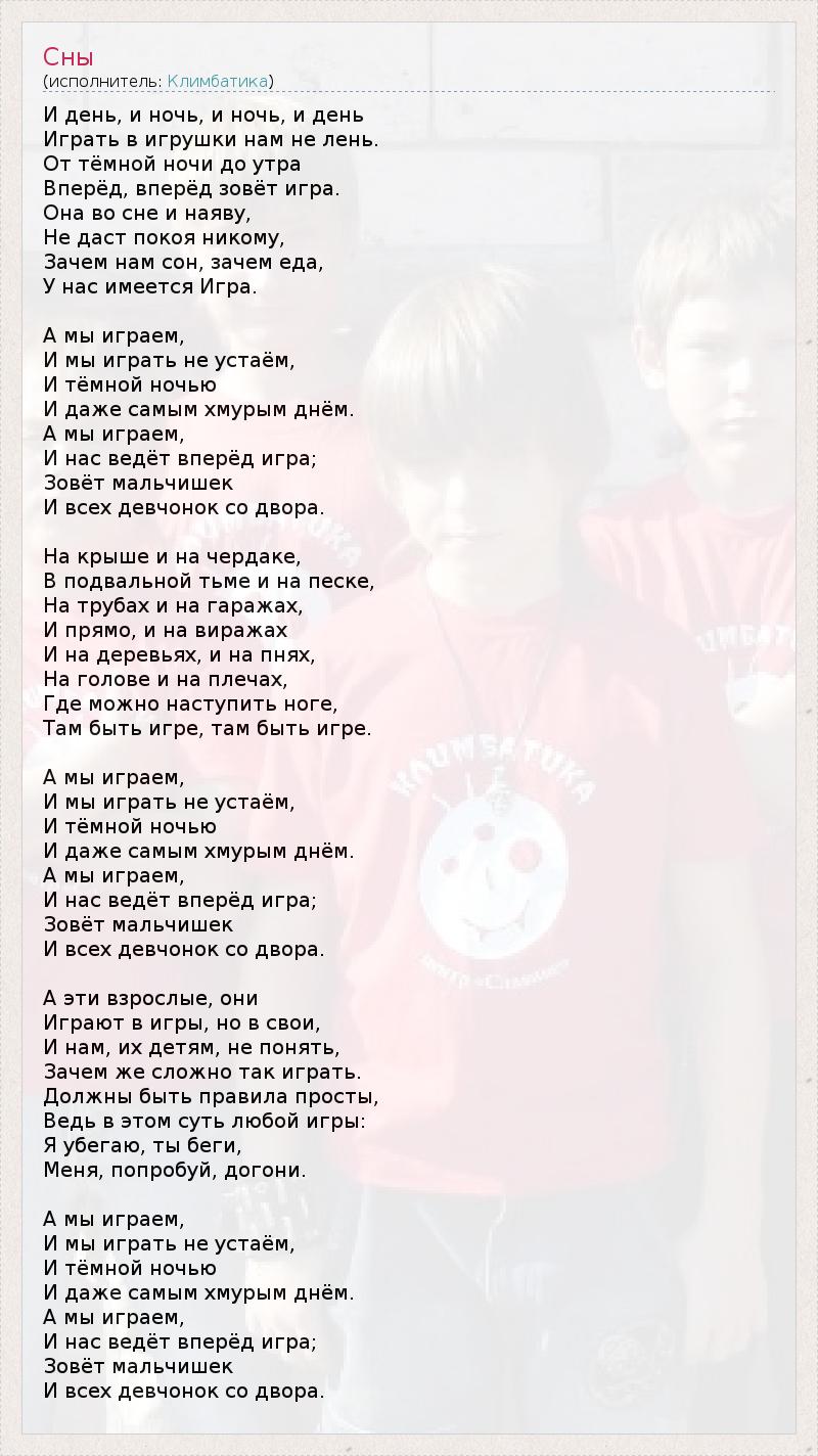И день, и ночь, и ночь, и день Играть в игрушки нам не лень. От тёмной ночи до утра Вперёд, вперёд зовёт игра. Она во сне и наяву, Не даст покоя никому, Зачем нам сон, зачем еда, У нас имеется Игра. А мы играем, И мы играть не устаём, И тёмной ночью И даже самым хмурым днём. А мы играем, И нас ведёт вперёд игра; Зовёт мальчишек И всех девчонок со двора. На крыше и на чердаке, В подвальной тьме и на песке, На трубах и на гаражах, И прямо, и на виражах И на деревьях, и на пнях, На голове и на плечах, Где можно наступить ноге, Там быть игре, там быть игре. А мы играем, И мы играть не устаём, И тёмной ночью И даже самым хмурым днём. А мы играем, И нас ведёт вперёд игра; Зовёт мальчишек И всех девчонок со двора. А эти взрослые, они Играют в игры, но в свои, И нам, их детям, не понять, Зачем же сложно так играть. Должны быть правила просты, Ведь в этом суть любой игры: Я убегаю, ты беги, Меня, попробуй, догони. А мы играем, И мы играть не устаём, И тёмной ночью И даже самым хмурым днём. А мы играем, И нас ведёт вперёд игра; Зовёт мальчишек И всех девчонок со двора.
