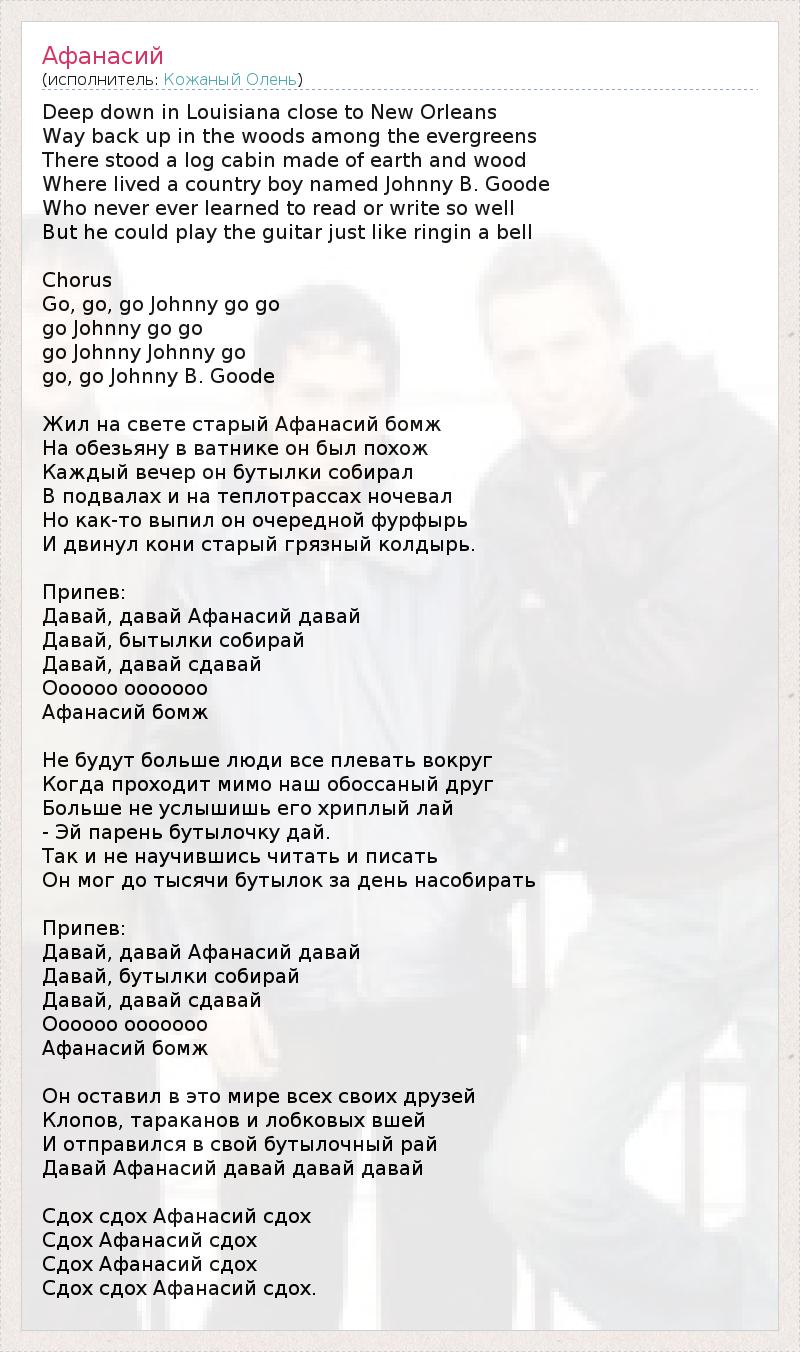 Deep down in Louisiana close to New Orleans Way back up in the woods among the evergreens There stood a log cabin made of earth and wood Where lived a country boy named Johnny B. Goode Who never ever learned to read or write so well But he could play the guitar just like ringin a bell Chorus Go, go, go Johnny go go go Johnny go go go Johnny Johnny go go, go Johnny B. Goode Жил на свете старый Афанасий бомж На обезьяну в ватнике он был похож Каждый вечер он бутылки собирал В подвалах и на теплотрассах ночевал Но как-то выпил он очередной фурфырь И двинул кони старый грязный колдырь. Припев: Давай, давай Афанасий давай Давай, бытылки собирай Давай, давай сдавай Оооооо ооооооо Афанасий бомж Не будут больше люди все плевать вокруг Когда проходит мимо наш обоссаный друг Больше не услышишь его хриплый лай - Эй парень бутылочку дай. Так и не научившись читать и писать Он мог до тысячи бутылок за день насобирать Припев: Давай, давай Афанасий давай Давай, бутылки собирай Давай, давай сдавай Оооооо ооооооо Афанасий бомж Он оставил в это мире всех своих друзей Клопов, тараканов и лобковых вшей И отправился в свой бутылочный рай Давай Афанасий давай давай давай Сдох сдох Афанасий сдох Сдох Афанасий сдох Сдох Афанасий сдох Сдох сдох Афанасий сдох.