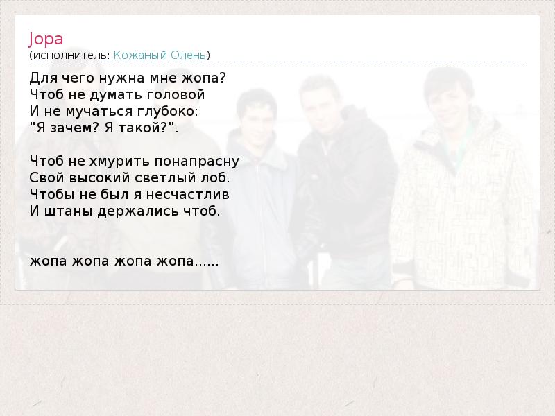 Кожаный олень - Жопа - Текст песни, слушать онлайн Кожаный олень - Жопа - Текст песни, слушать онлайн