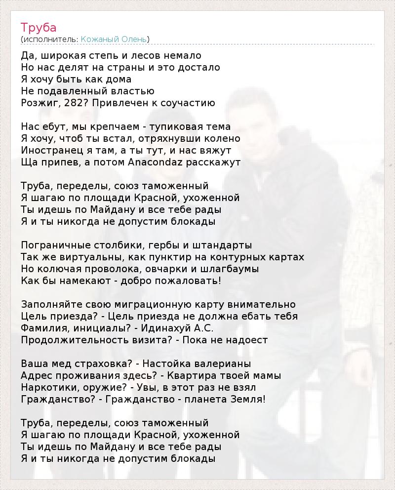 Да, широкая степь и лесов немало Но нас делят на страны и это достало Я хочу быть как дома Не подавленный властью Розжиг, 282? Привлечен к соучастию Нас ебут, мы крепчаем - тупиковая тема Я хочу, чтоб ты встал, отряхнувши колено Иностранец я там, а ты тут, и нас вяжут Ща припев, а потом Anacondaz расскажут Труба, переделы, союз таможенный Я шагаю по площади Красной, ухоженной Ты идешь по Майдану и все тебе рады Я и ты никогда не допустим блокады Пограничные столбики, гербы и штандарты Так же виртуальны, как пунктир на контурных картах Но колючая проволока, овчарки и шлагбаумы Как бы намекают - добро пожаловать! Заполняйте свою миграционную карту внимательно Цель приезда? - Цель приезда не должна ебать тебя Фамилия, инициалы? - Идинахуй А.С. Продолжительность визита? - Пока не надоест Ваша мед страховка? - Настойка валерианы Адрес проживания здесь? - Квартира твоей мамы Наркотики, оружие? - Увы, в этот раз не взял Гражданство? - Гражданство - планета Земля! Труба, переделы, союз таможенный Я шагаю по площади Красной, ухоженной Ты идешь по Майдану и все тебе рады Я и ты никогда не допустим блокады