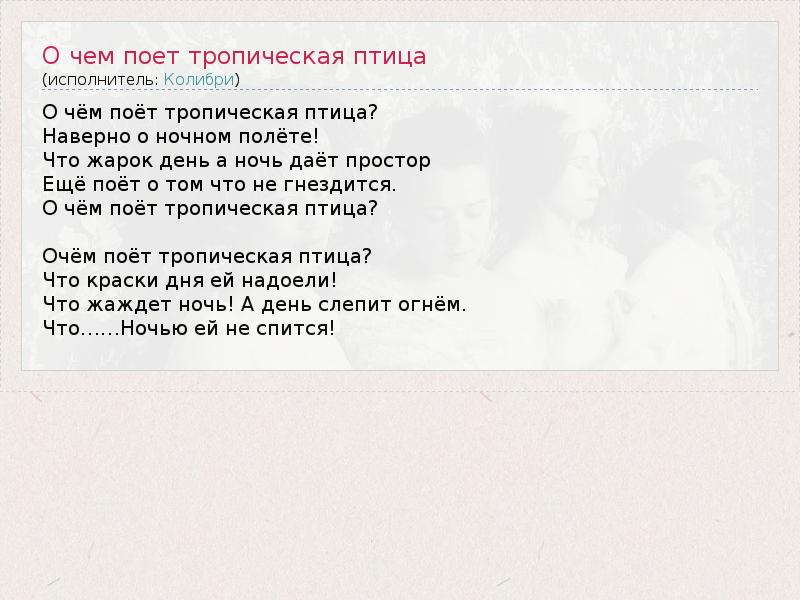 А как ты думаешь, о чем песня "О чем поет тропическая птица" ?